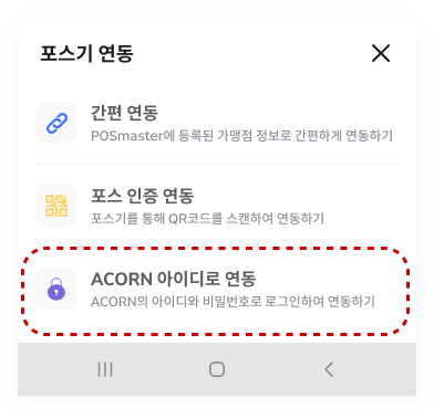 ACORN 아이디로 연동 : 포스마스터 영업정보시스템(ACORN)에 생성된 아이디와 비밀번호를 입력하여 연동