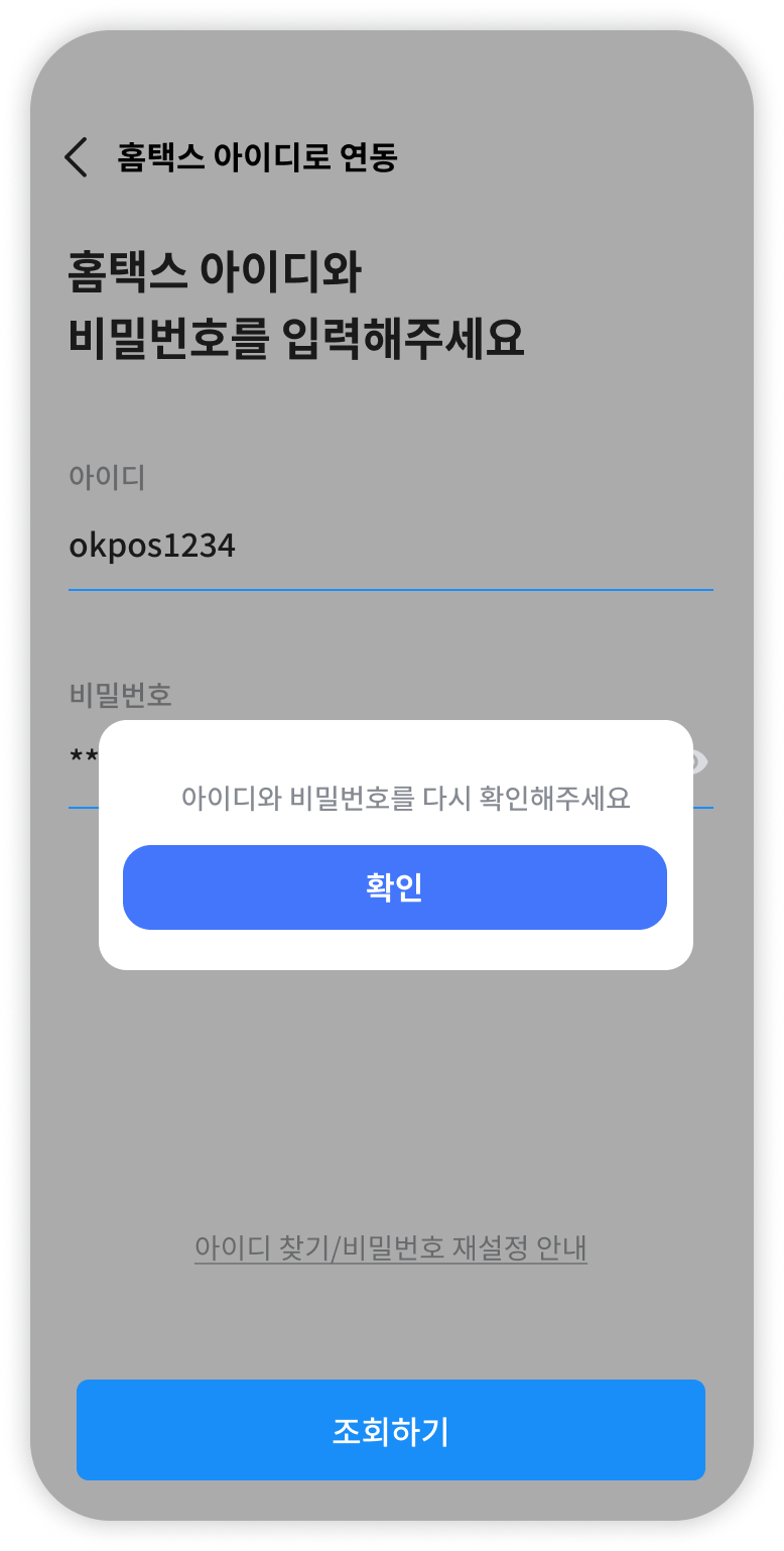 잘못된 홈택스 아이디와 비밀번호를 입력한 경우 '아이디와 비밀번호를 다시 확인해주세요' 라는 메세지가 뜹니다.