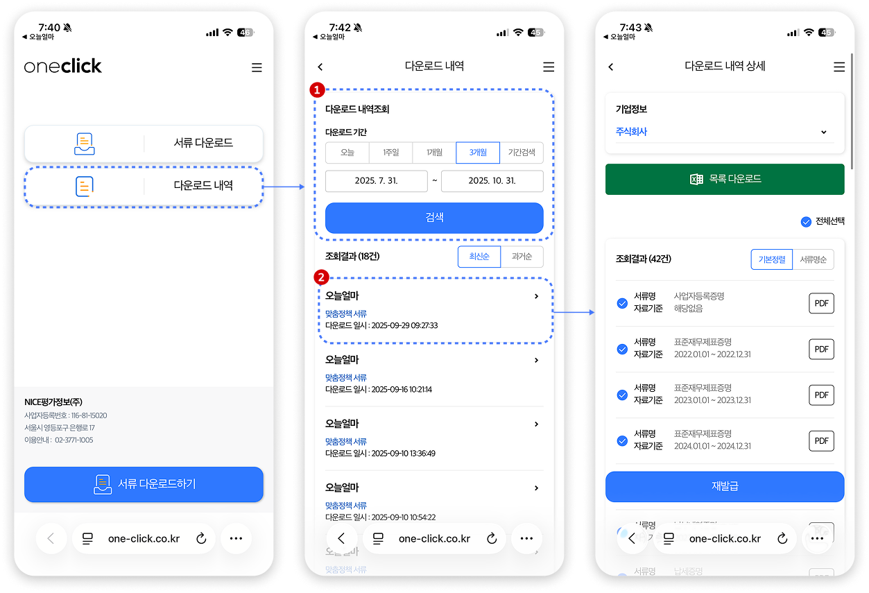 ๋ค์ด๋ก๋ ๋ด์ญ ํด๋ฆญ โ 1) ๋ด์ญ ์กฐํ ๊ธฐ๊ฐ ์ ๋ ฅ ํ ๊ฒ์ 2) ๋ค์ด๋ก๋ ๋ด์ญ ํด๋ฆญ โ ๋ค์ด๋ก๋ ๋ด์ญ ์์ธ ํ์ธ