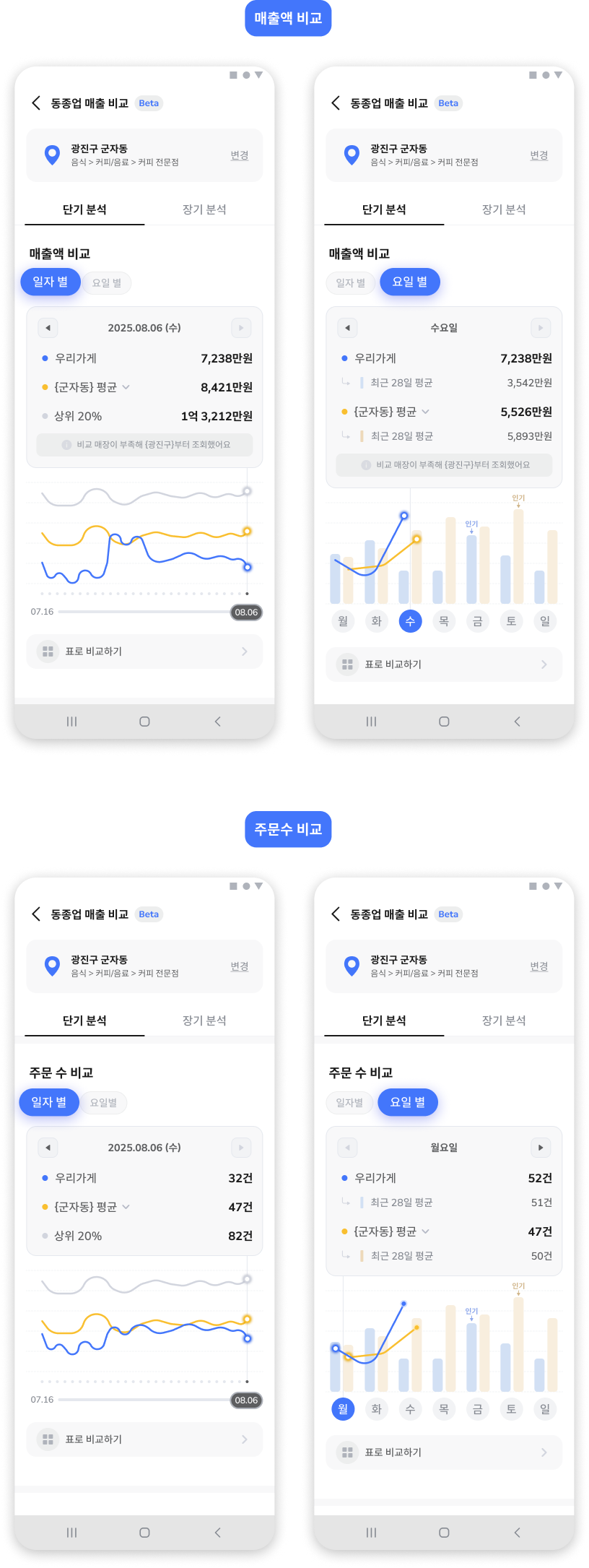 ๋งค์ถ์ก ๋น๊ต : ์ฐ๋ฆฌ ๊ฐ๊ฒ์ ์ฃผ๋ณ ์๊ถ์ ์ผ์ ๋ณ, ์์ผ ๋ณ ๋งค์ถ์ ๋น๊ตํ ์ ์์ด์.