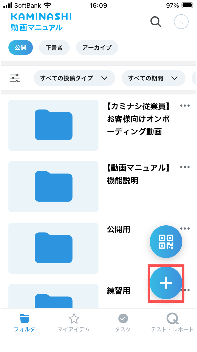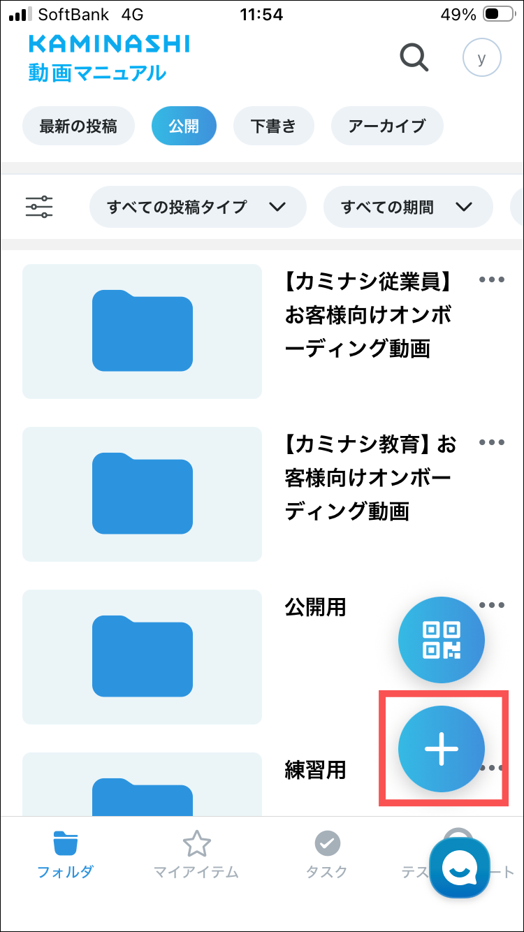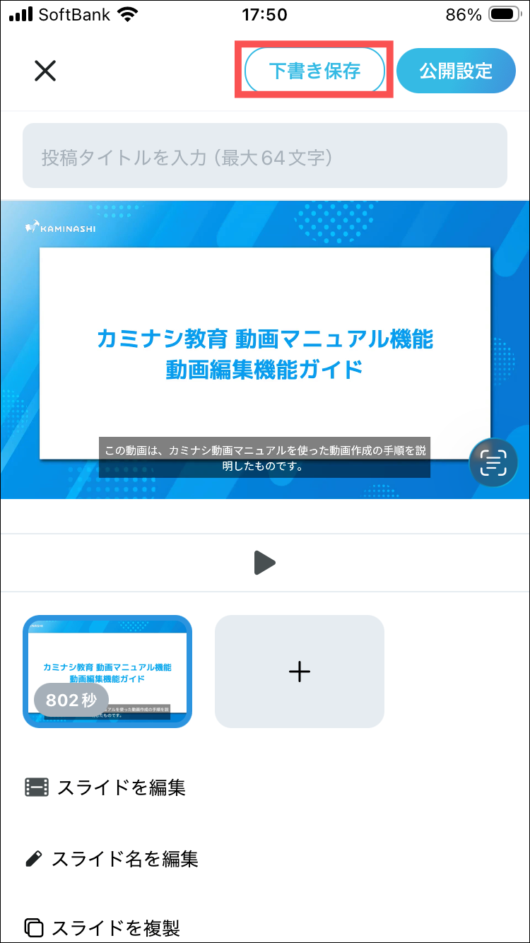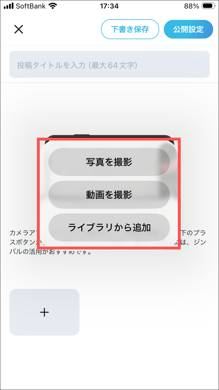 1.カミナシ動画マニュアルのアプリ(VideoStep)にログインする2.「+」を押す3.「+」を押す4.「写真を撮影」「動画を撮影」「ライブラリから追加」のいずれかを押す「ライブラリから追加」を押した場合は、画像や動画を選択してください。5.「下書き保存」を押すよくある質問は、こちらからご確認ください。