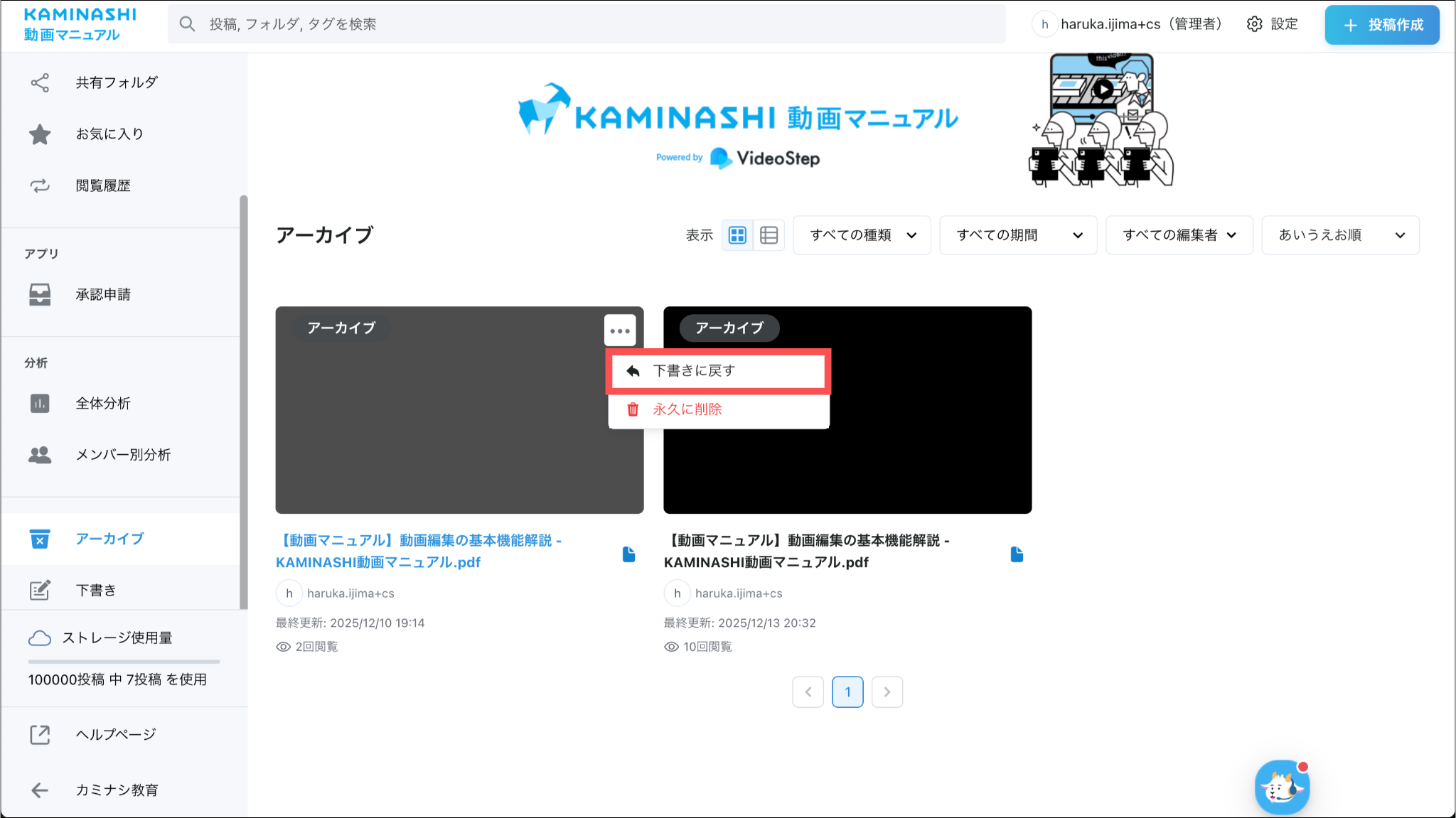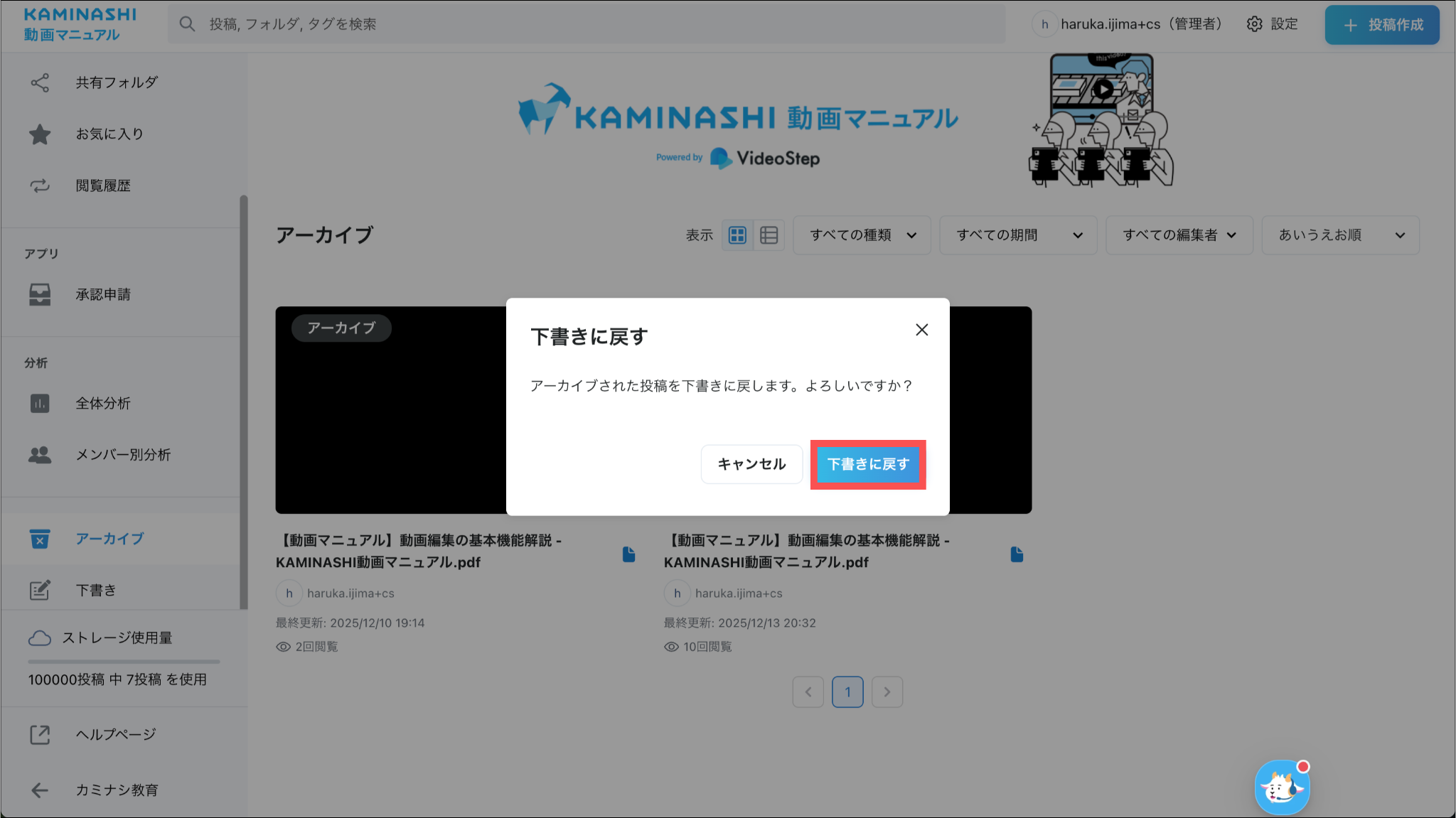 1.カミナシ動画マニュアルにログインする2.「アーカイブ」を開き、下書きに戻す投稿にカーソルを合わせ「⋯」を押し、「下書きに戻す」を選択する3.「下書きに戻す」を押すよくある質問は、こちらからご確認ください。