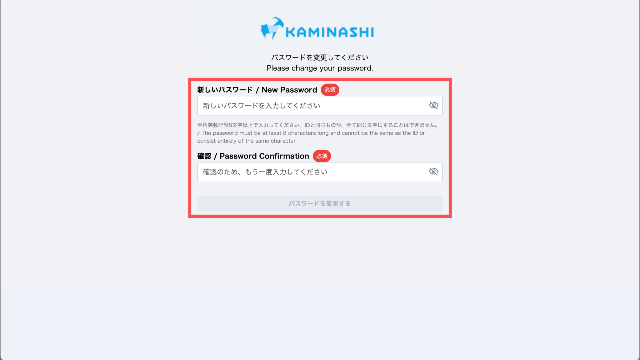新しいパスワードと確認は同じ文字を入力します。