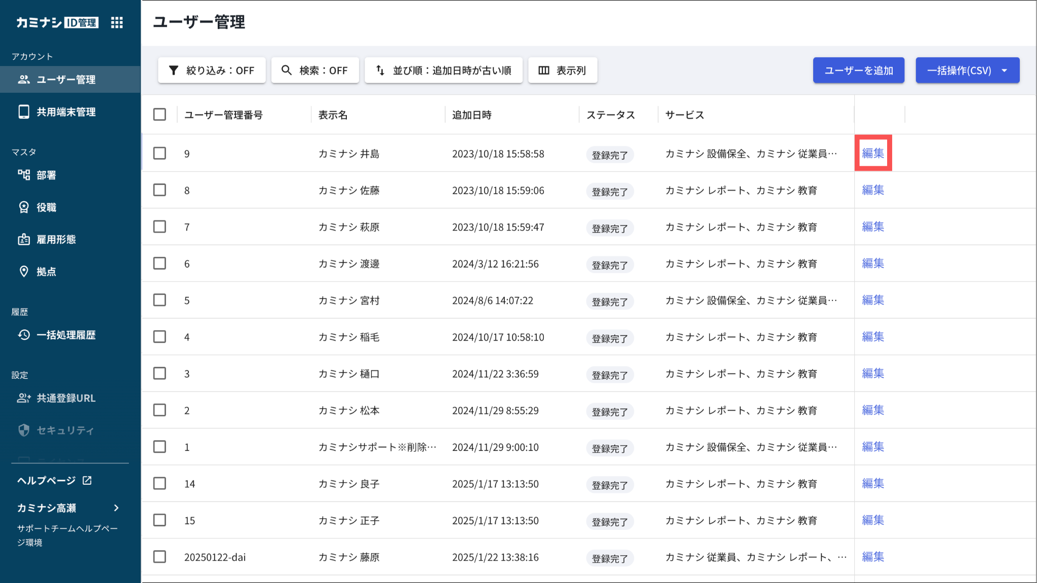 カミナシレポート・カミナシ従業員・カミナシ教育・カミナシ設備保全・カミナシID管理のいずれかにアクセスします。
