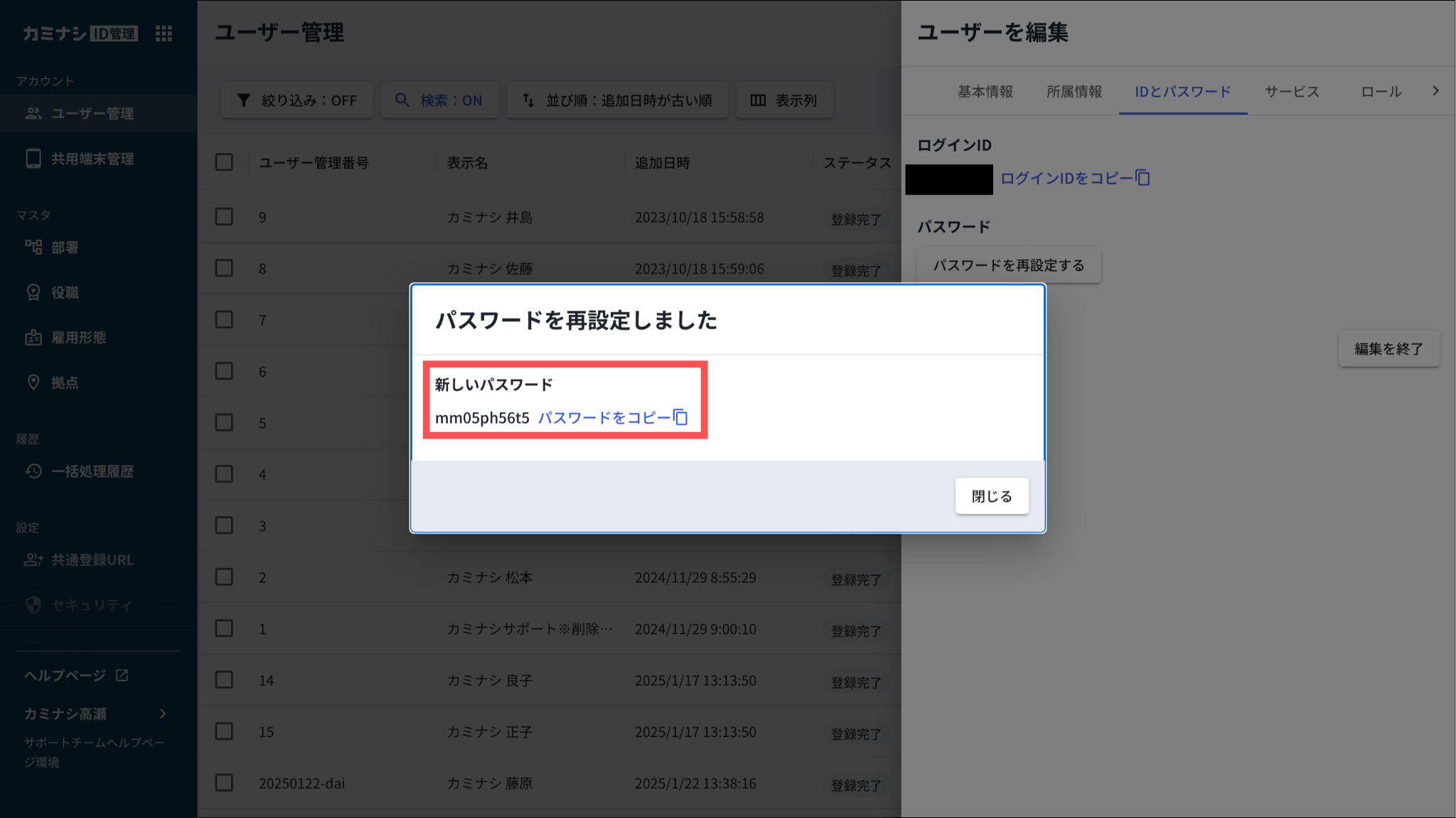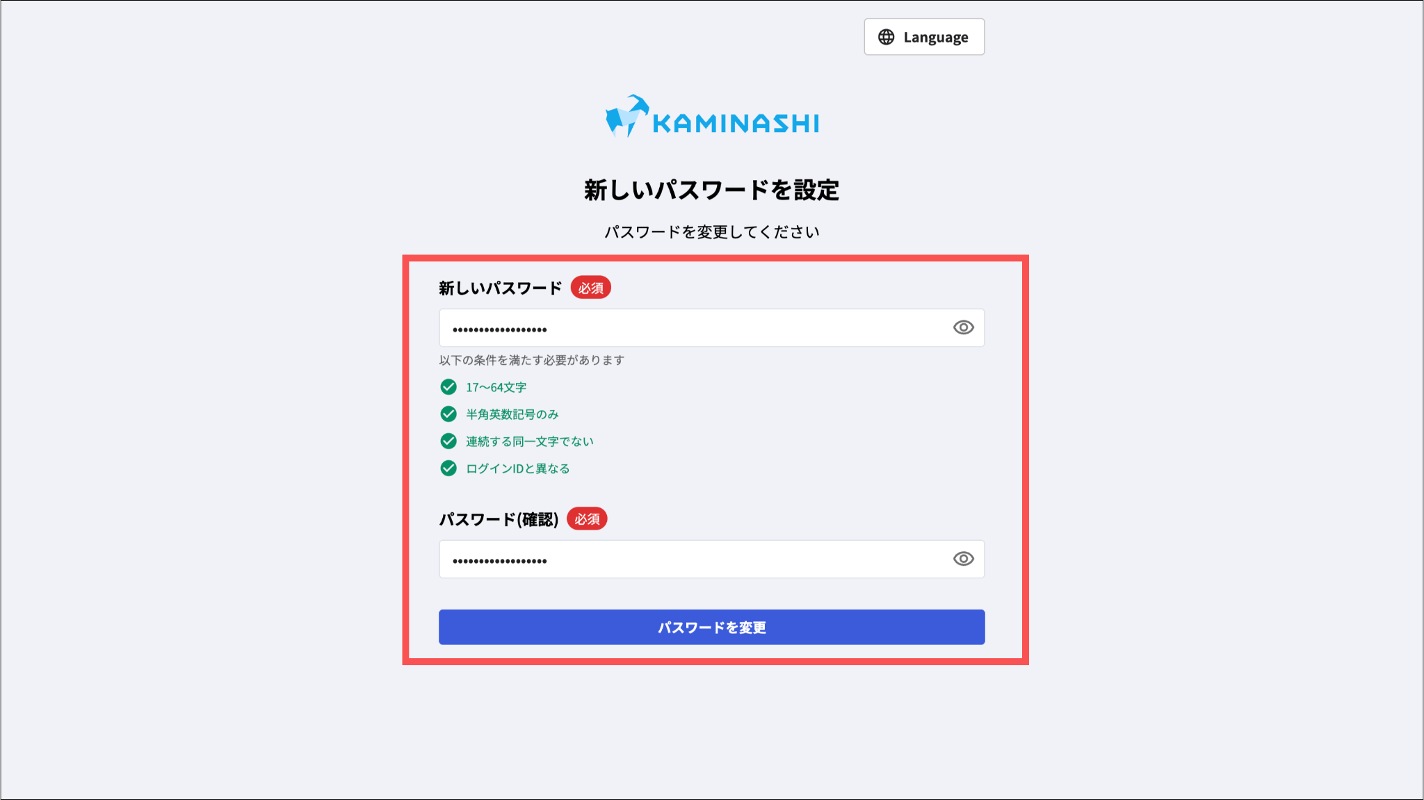 画面に表示されたポリシーに準拠した文字数、文字種を使用して、ログインIDと異なる文字列を使用してください。