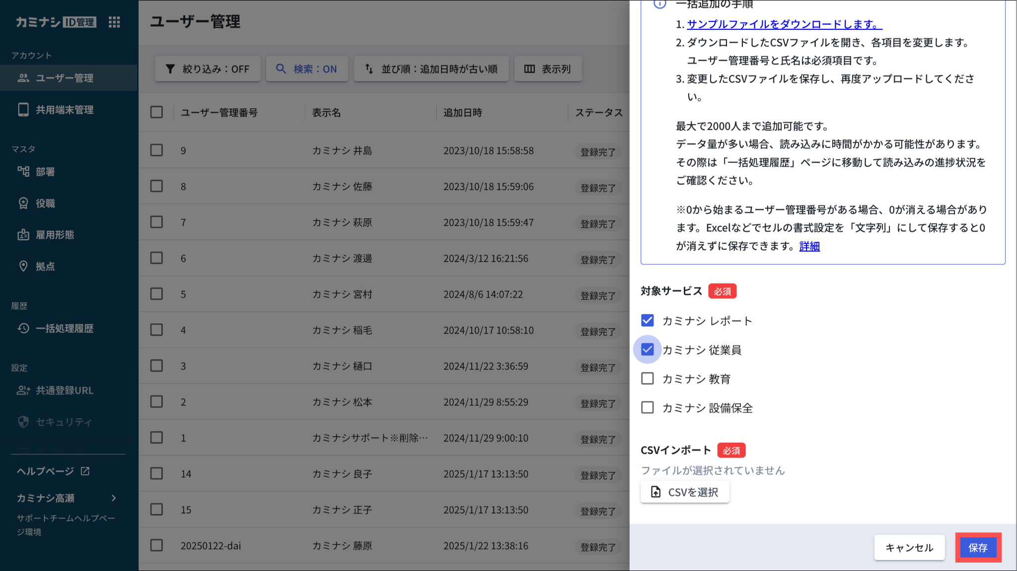 CSVファイルを使った一括登録では、主務の部署を設定することができます。