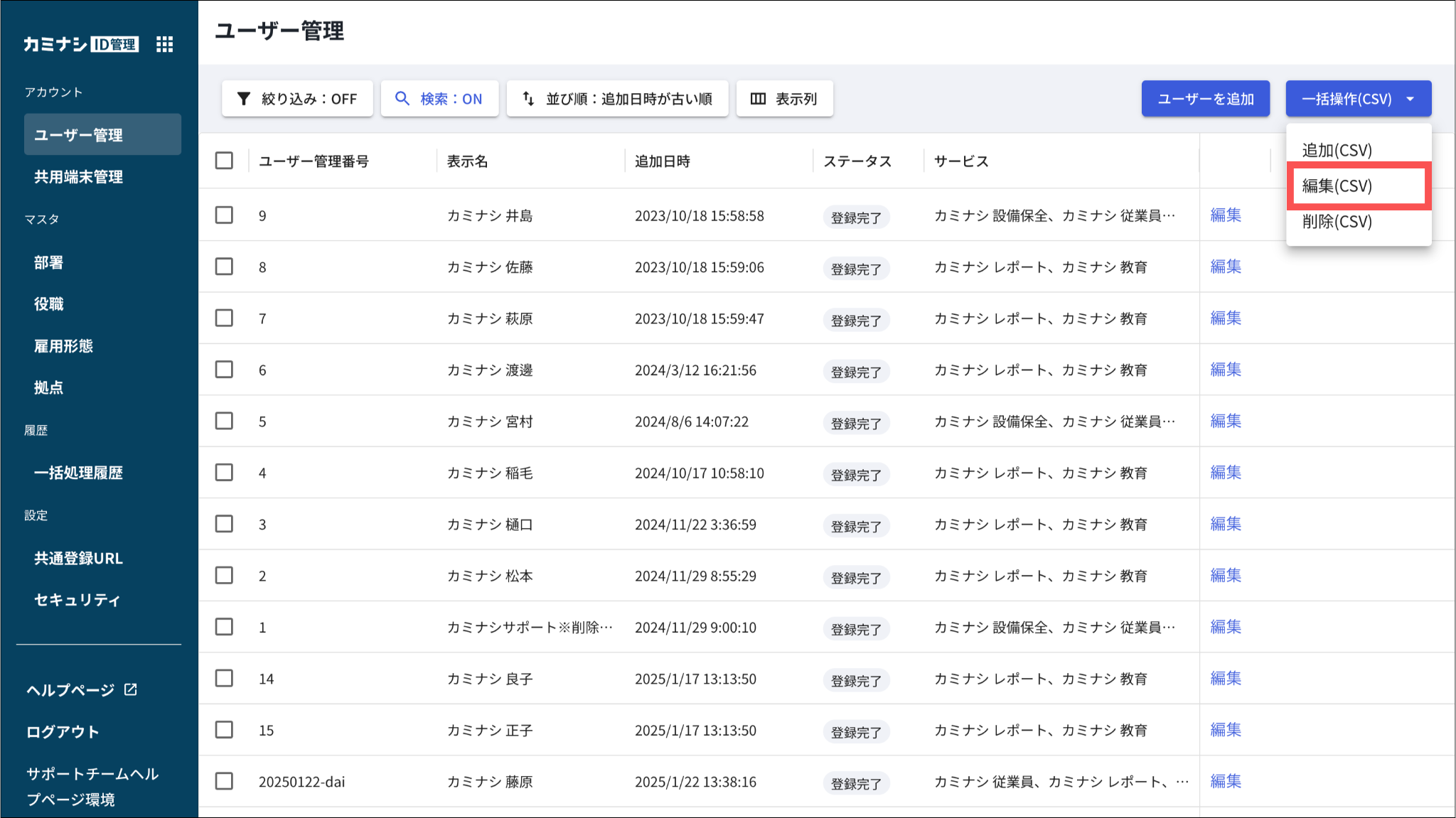 CSVファイルを使った一括編集では、ユーザー管理番号を一括で更新することはできません。