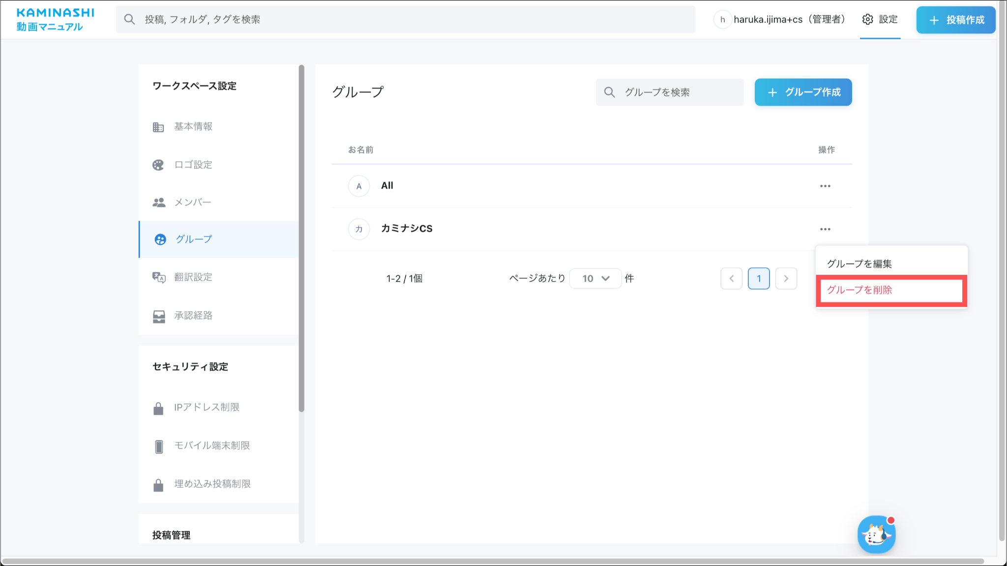 1.カミナシ動画マニュアルにログインする2.「設定」を開き、「グループ」を押す3.削除するグループの「⋯」を押す4.「グループを削除」を押す5.「削除する」を押すよくある質問は、こちらからご確認ください。