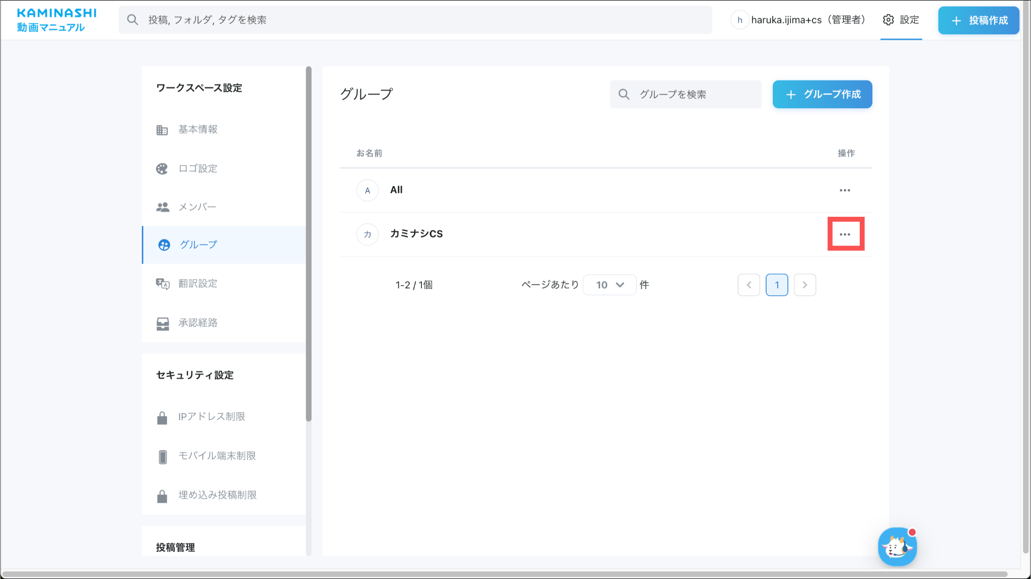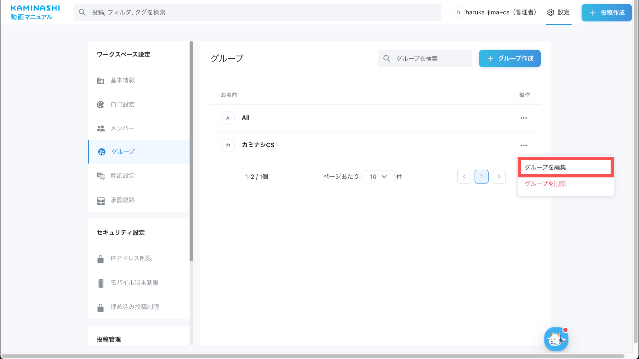 1.カミナシ動画マニュアルにログインする2.「設定」を開き、「グループ」を押す3.編集するグループの「⋯」を押す4.「グループを編集」を押す5.グループ情報を変更し、「決定」を押すよくある質問は、こちらからご確認ください。