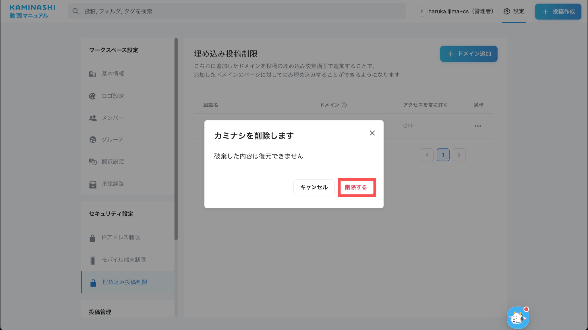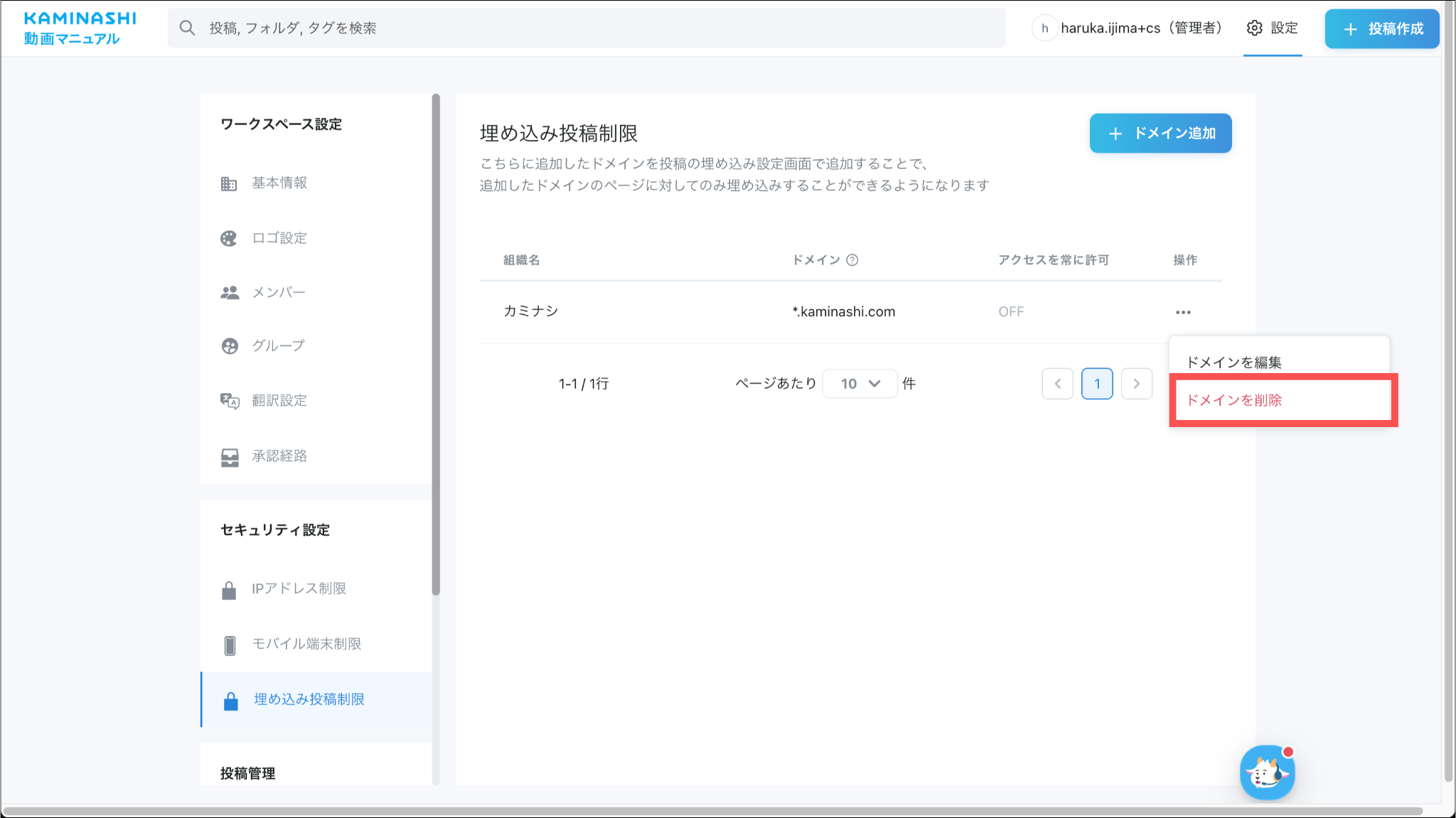1.カミナシ動画マニュアルにログインする2.「設定」を開き、「埋め込み投稿制限」を押す3.削除するドメインの「⋯」を押す4.「ドメインを削除」を押す5.「削除する」を押すよくある質問は、こちらからご確認ください。