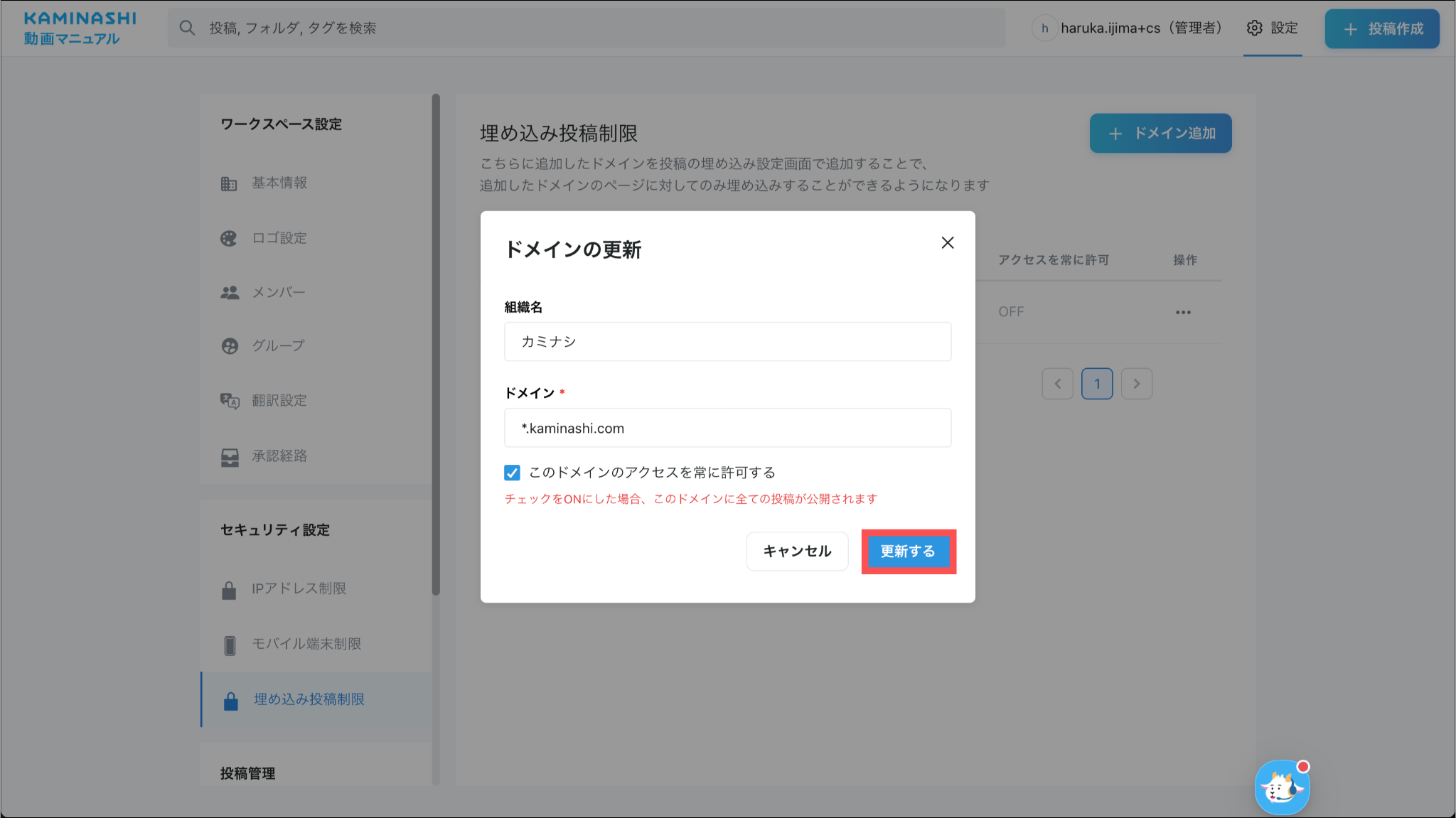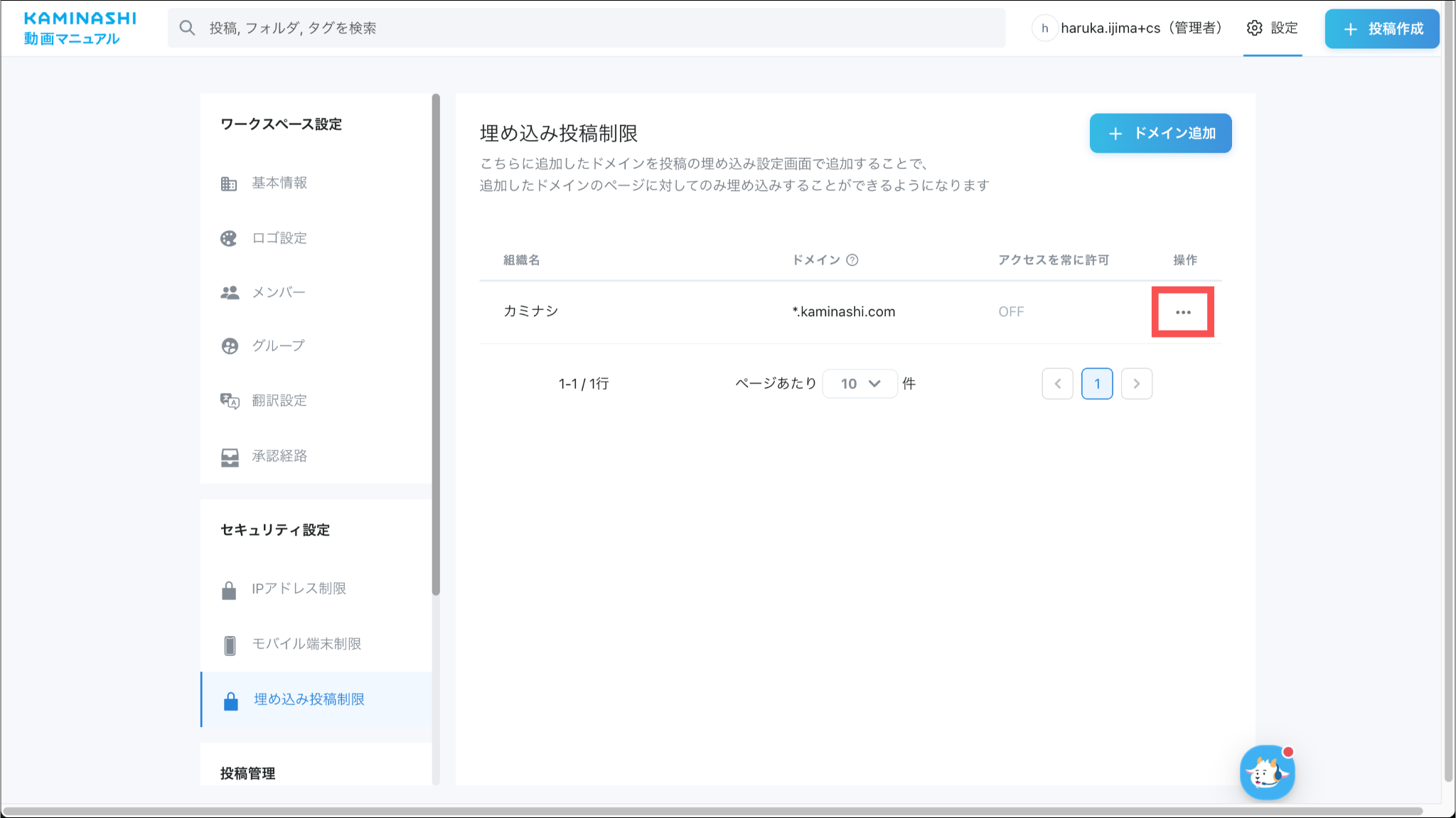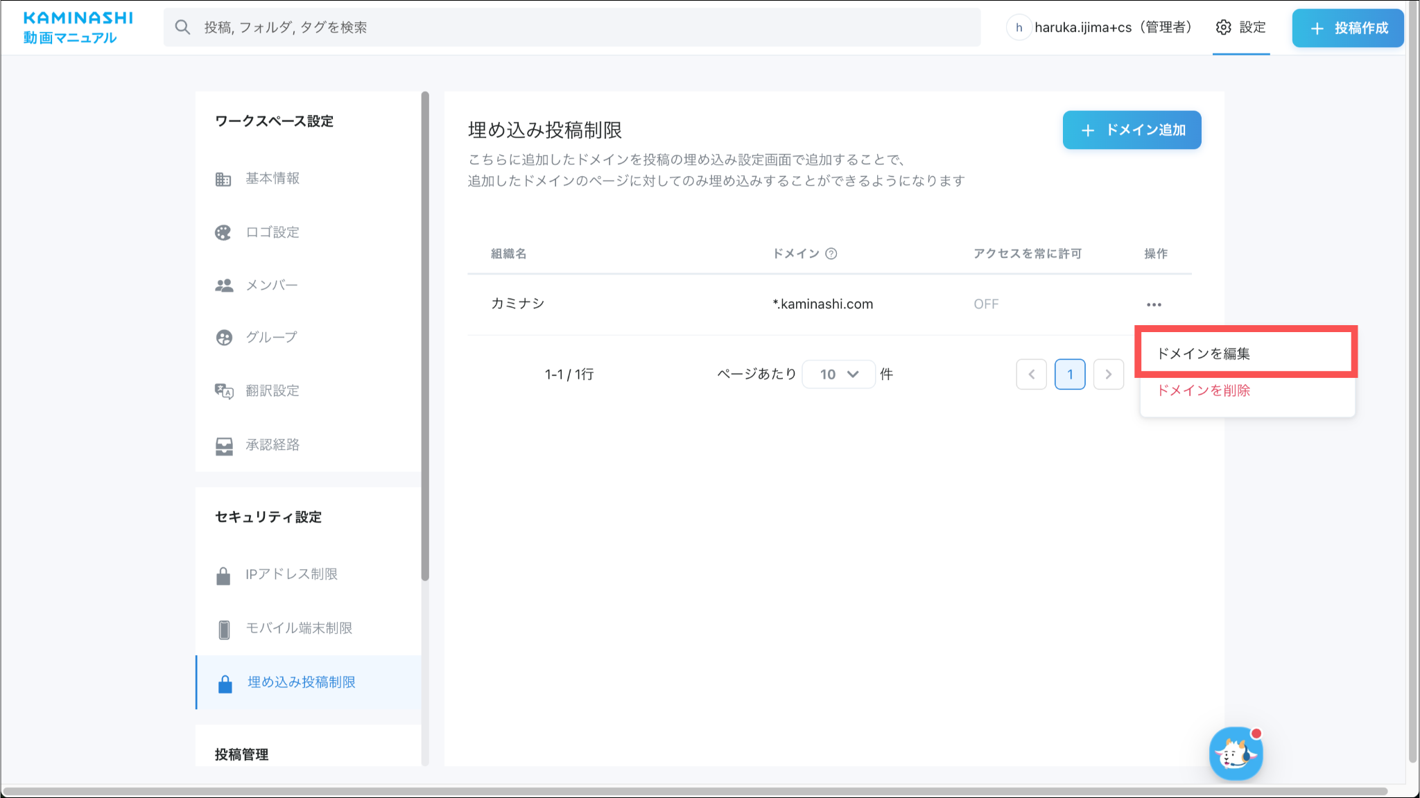 1.カミナシ動画マニュアルにログインする2.「設定」を開き、「埋め込み投稿制限」を押す3.編集するドメインの「⋯」を押す4.「ドメインを編集」を押す5. ドメイン情報を変更し、「更新する」を押すよくある質問は、こちらからご確認ください。