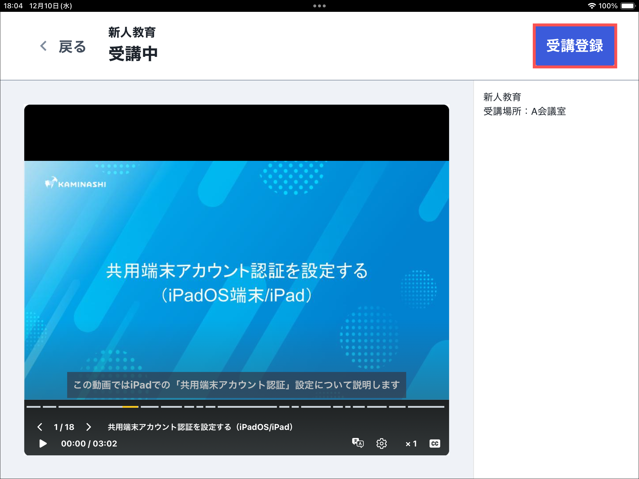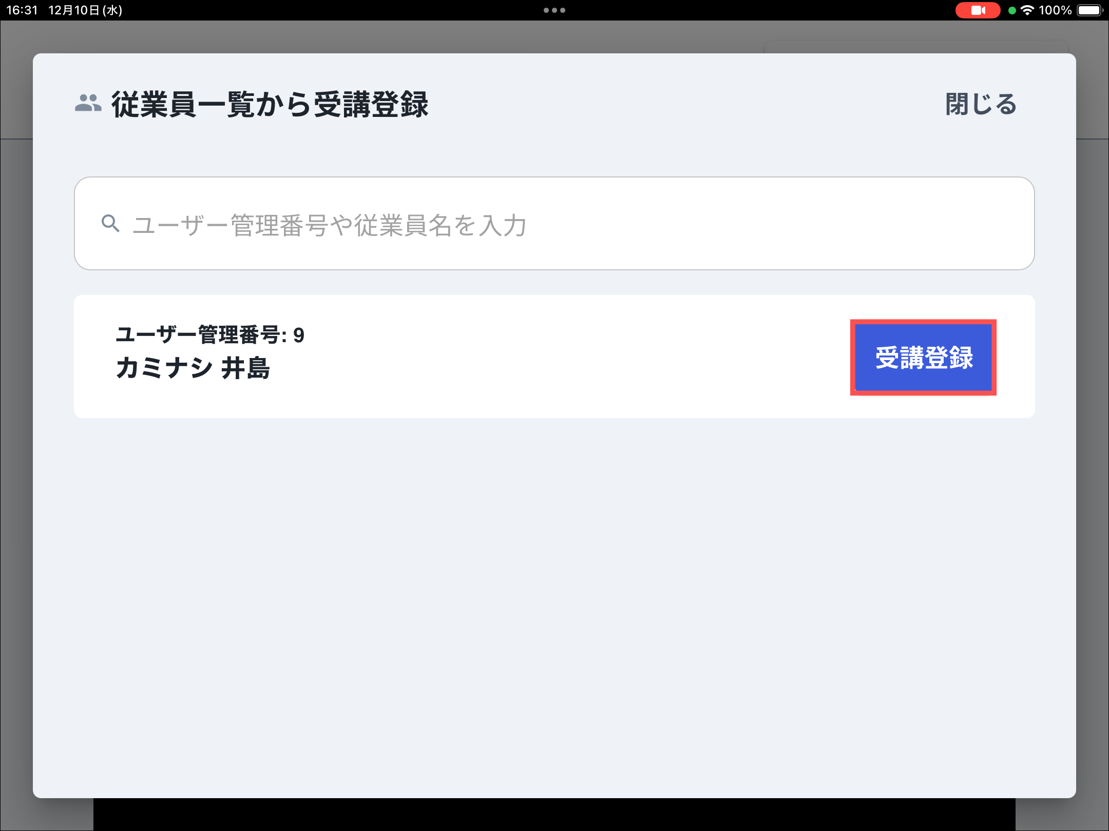 「〇〇(ユーザー名)さんの受講登録が完了しました」と表示され、受講状況が「受講済」となります。
