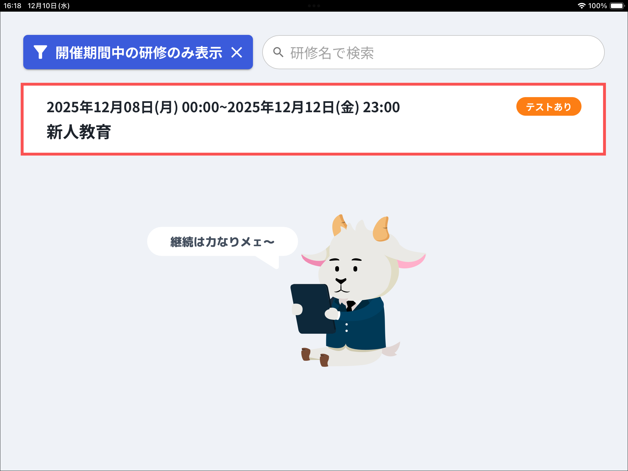 「開催期間中の研修のみ表示」を押すと開催中の研修のみ表示されます。