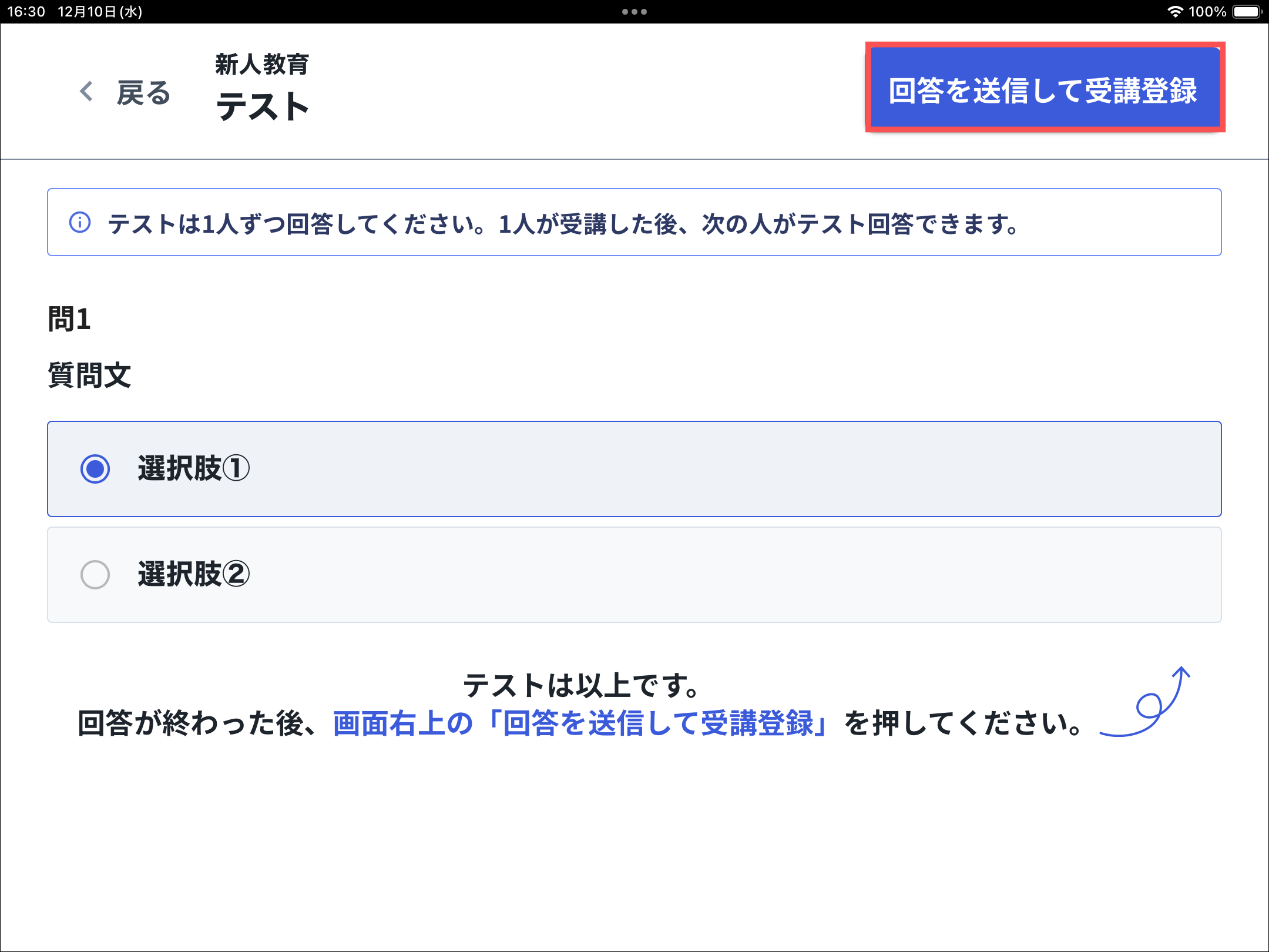 続けて次の受講対象者がテストを実施する場合は、「次の人がテストを回答」を押すとテスト回答画面が表示されます。