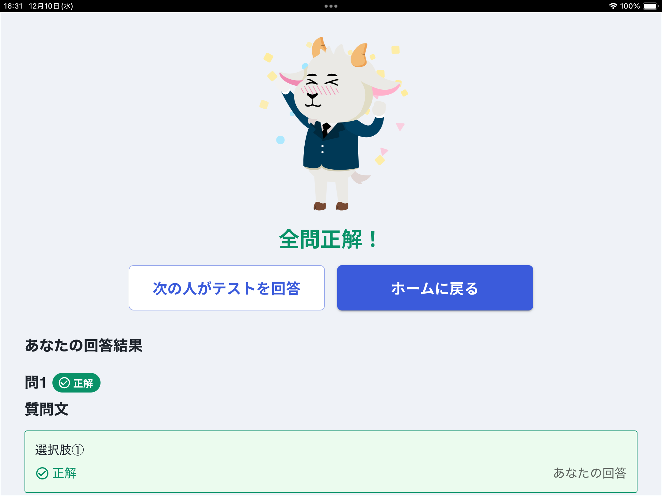 回答結果と正解を確認することができます。