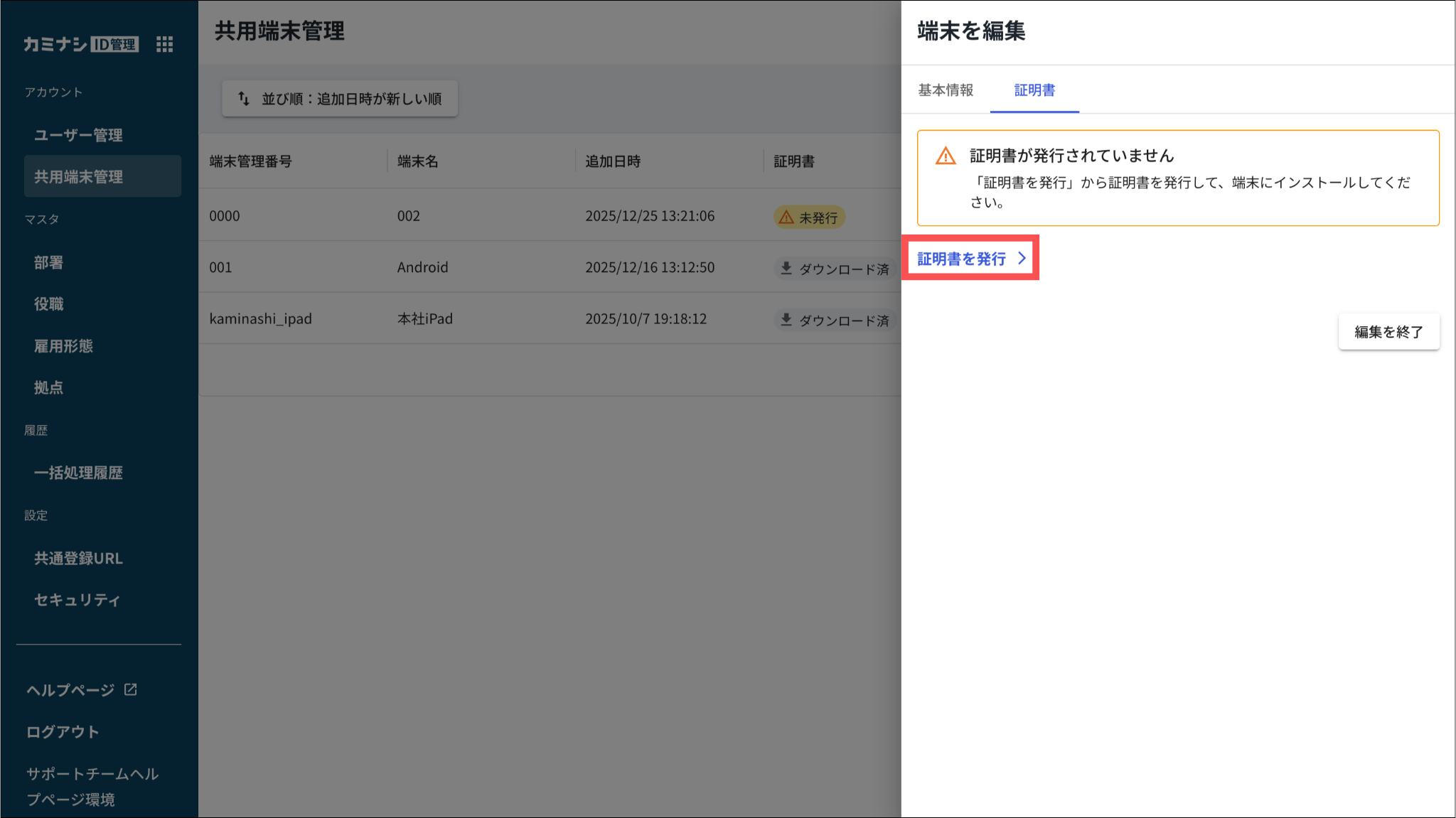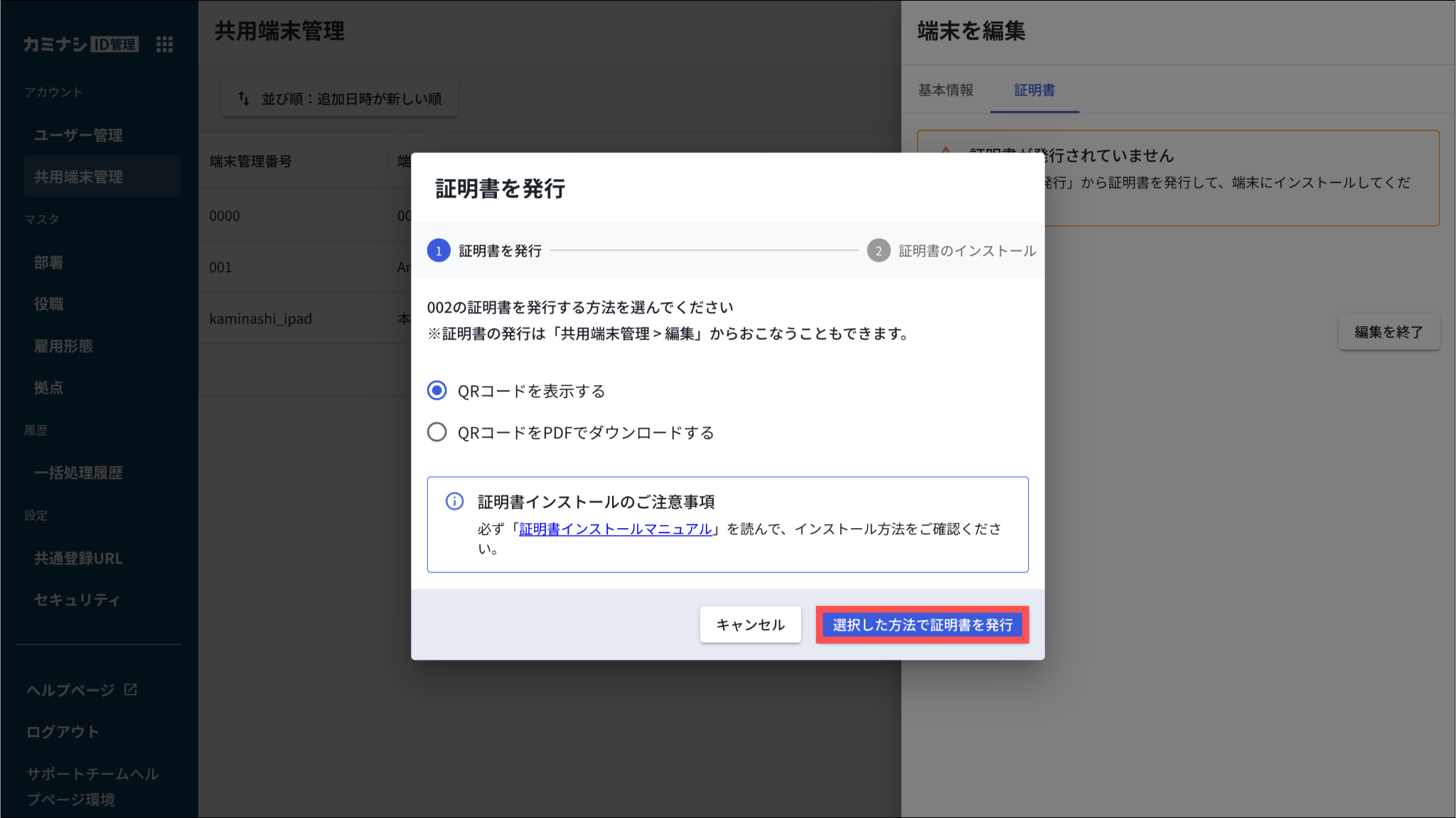 ※「QRコードを表示する」を選択した場合、iPadやAndroidでの証明書インストールが完了するまで、この画面は開いたままにしてください。