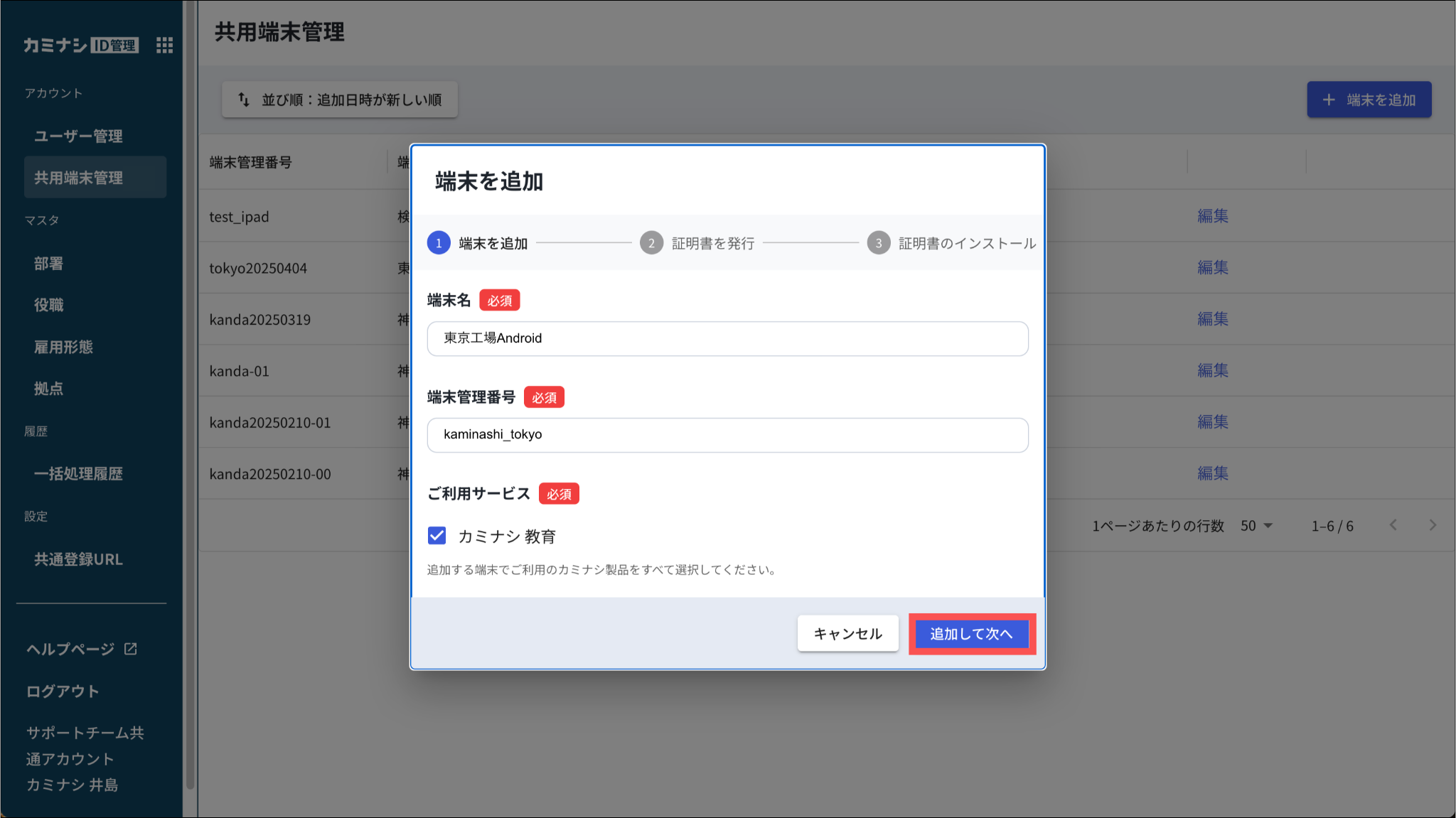 「追加のみで終了」を押すと証明書を発行せずに登録を終了します。