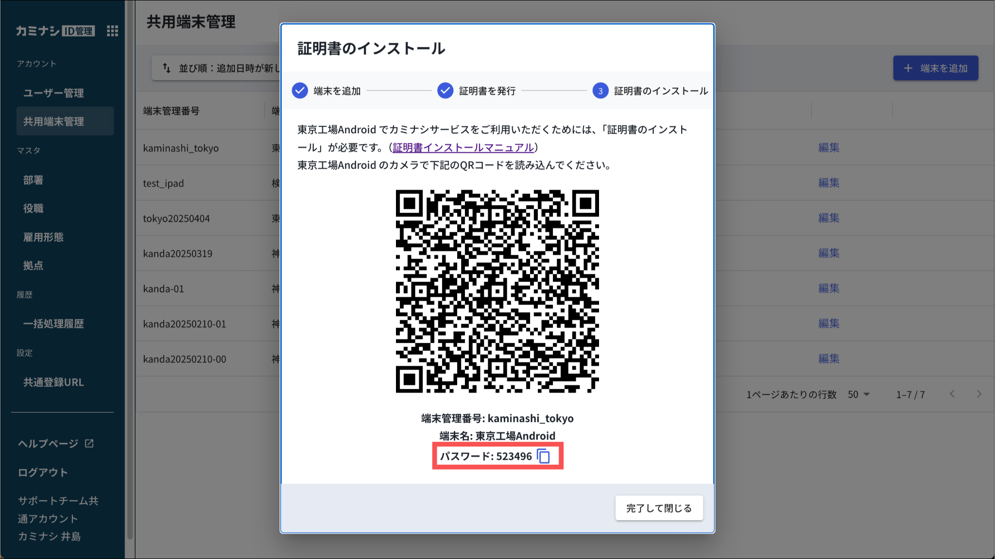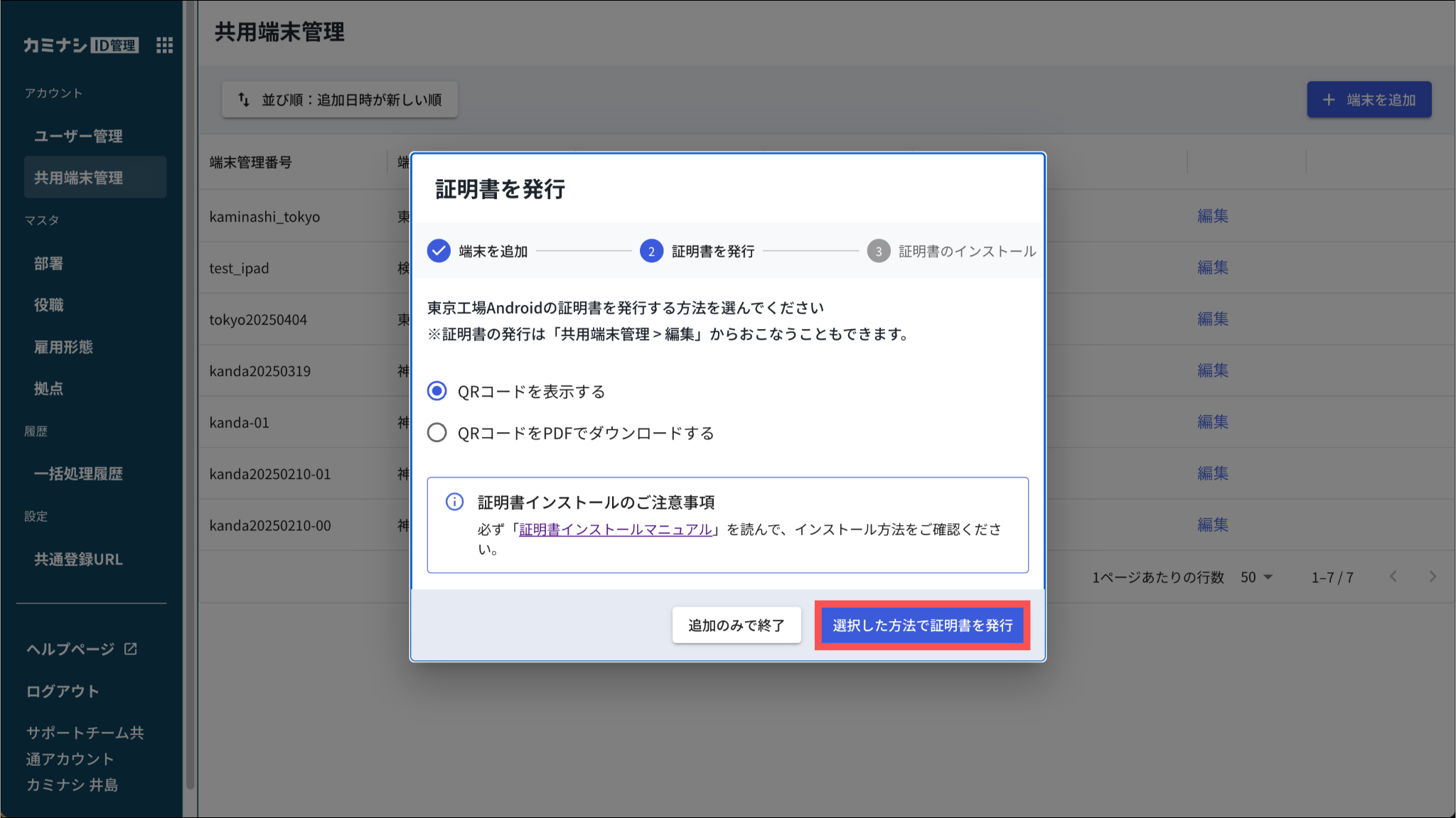 ※「QRコードを表示する」を選択した場合、iPadやAndroidでの証明書インストールが完了するまで、この画面は開いたままにしてください。
