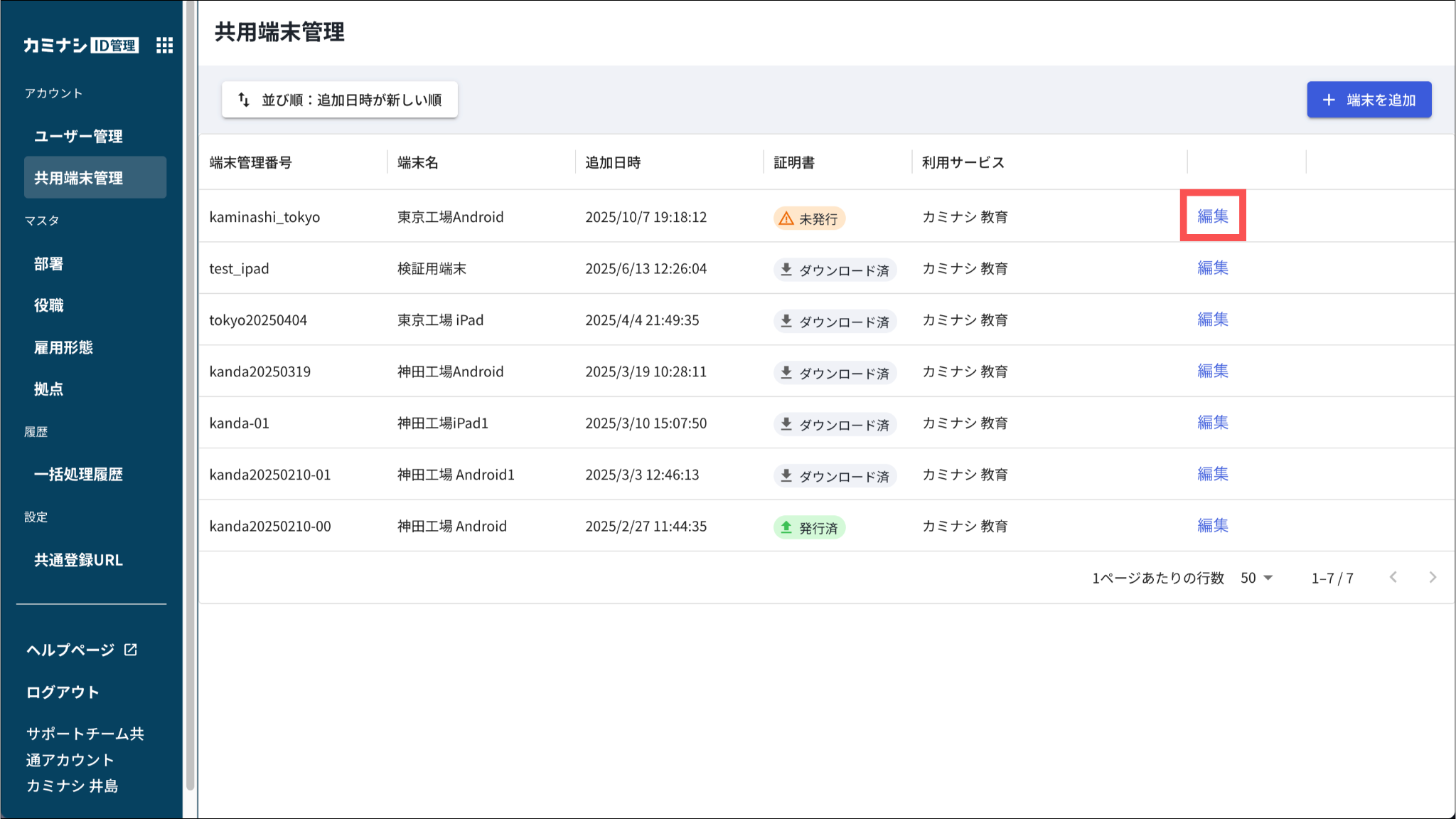2.「共用端末管理」を開き、編集する共用端末の「編集」を押す