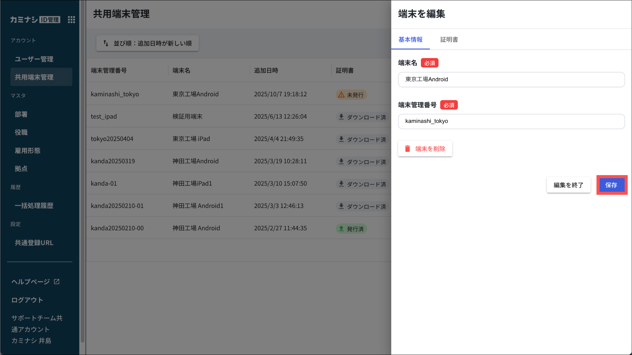 3.端末情報を変更し、「保存」を押す