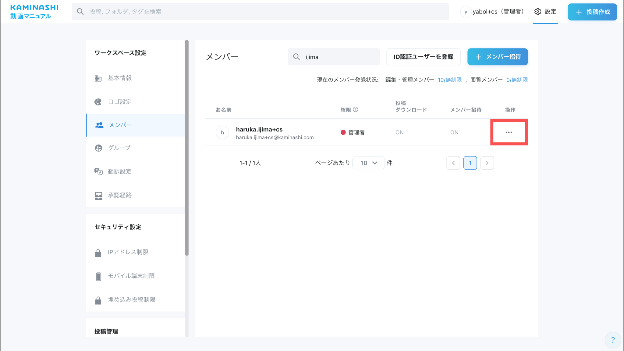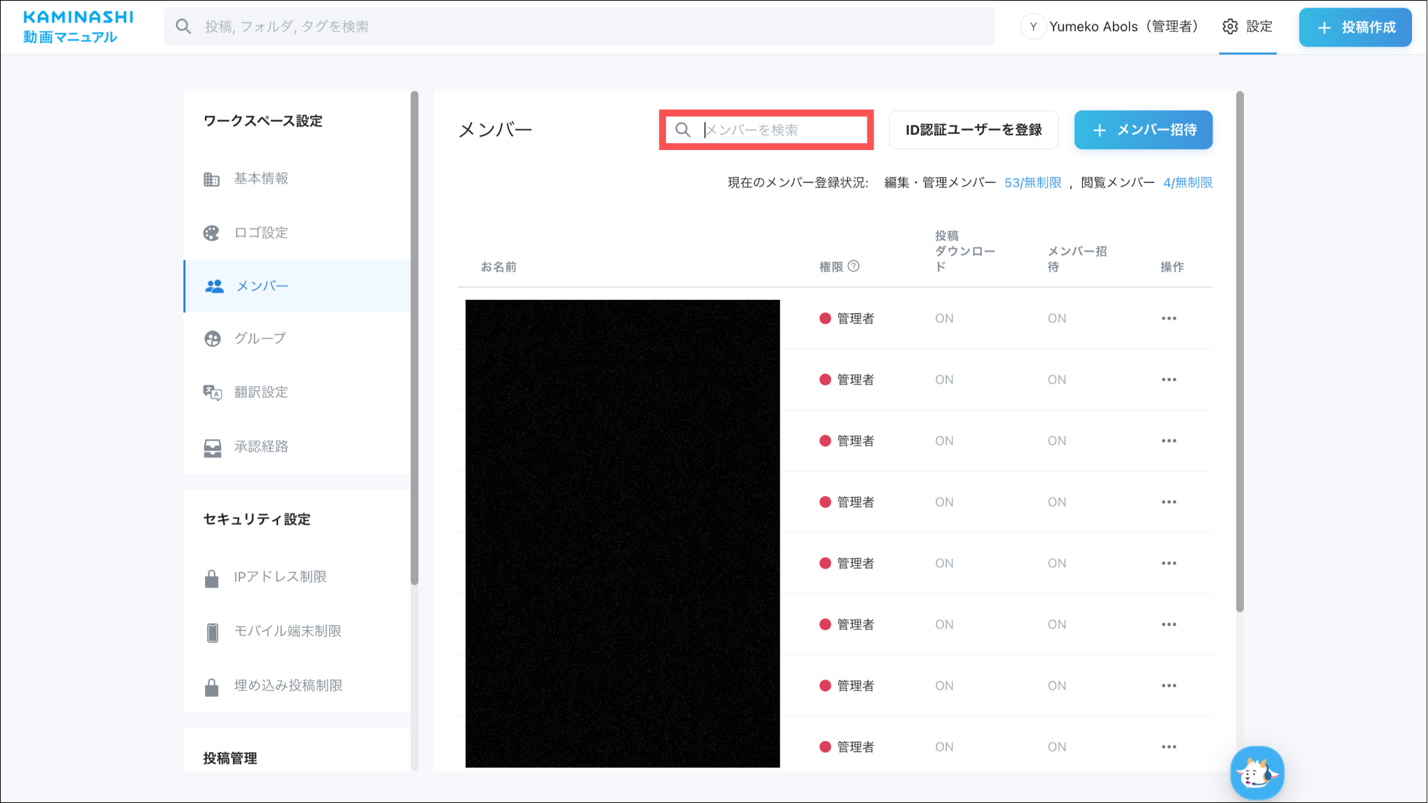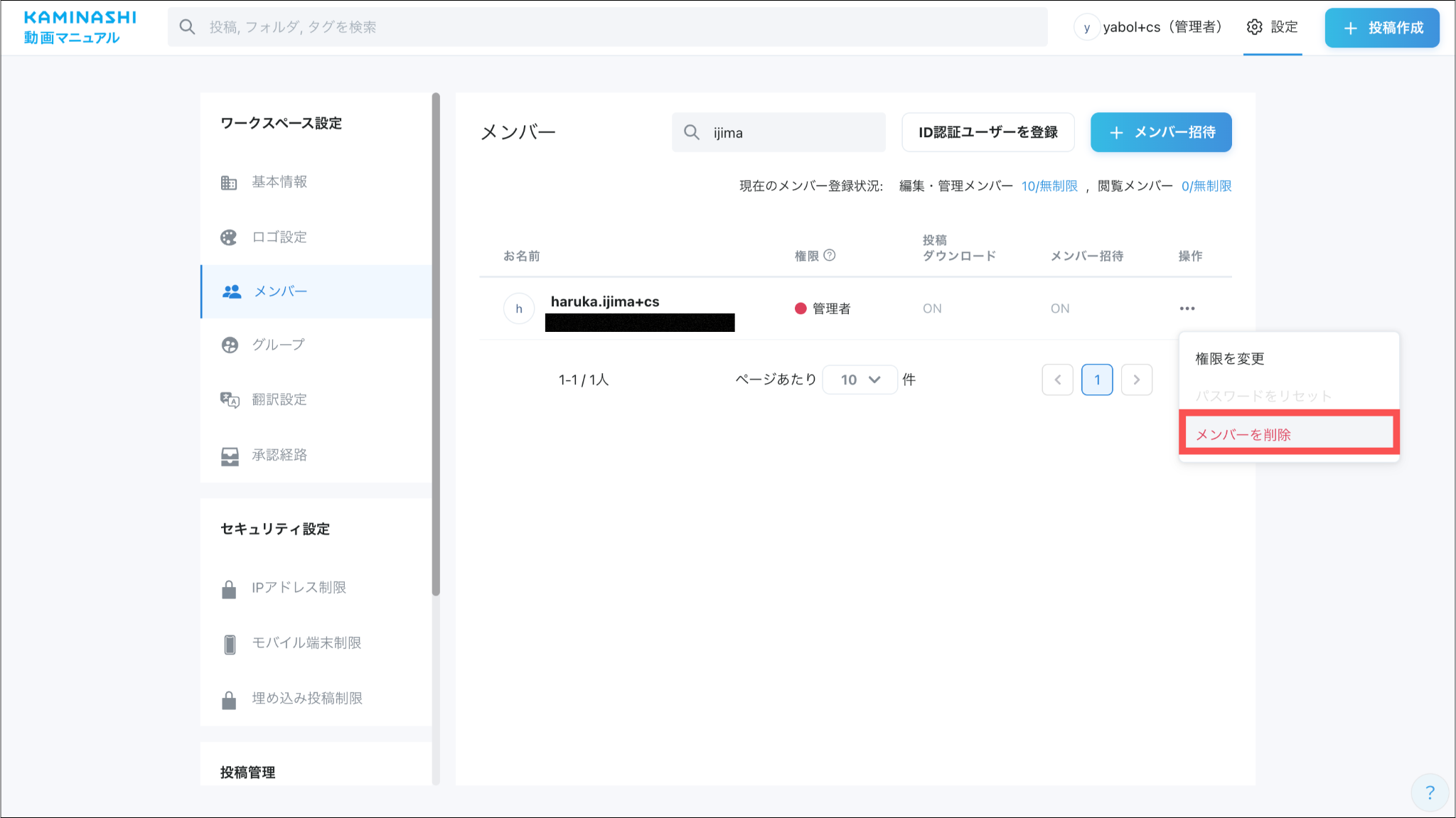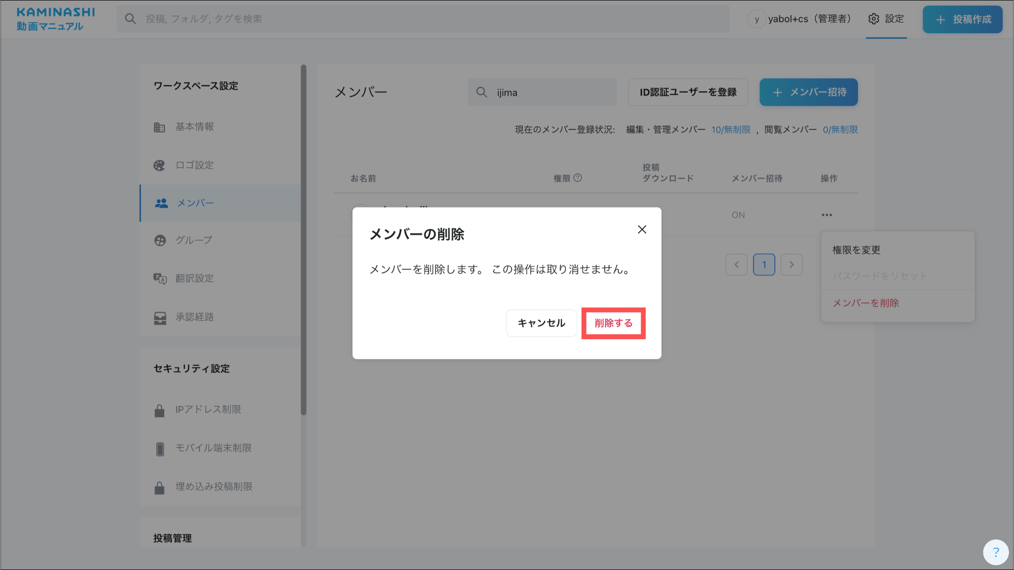 1.カミナシ動画マニュアルにログインする2.「設定」を開き、「メンバー」を押す3.削除したいユーザーを検索する4.削除するユーザーの「⋯」を押す5.「メンバーを削除」を押す6.「削除する」を押す削除されたユーザーは、すぐにカミナシ動画マニュアルを利用できなくなり復元できませんのでご注意ください。よくある質問は、こちらからご確認ください。