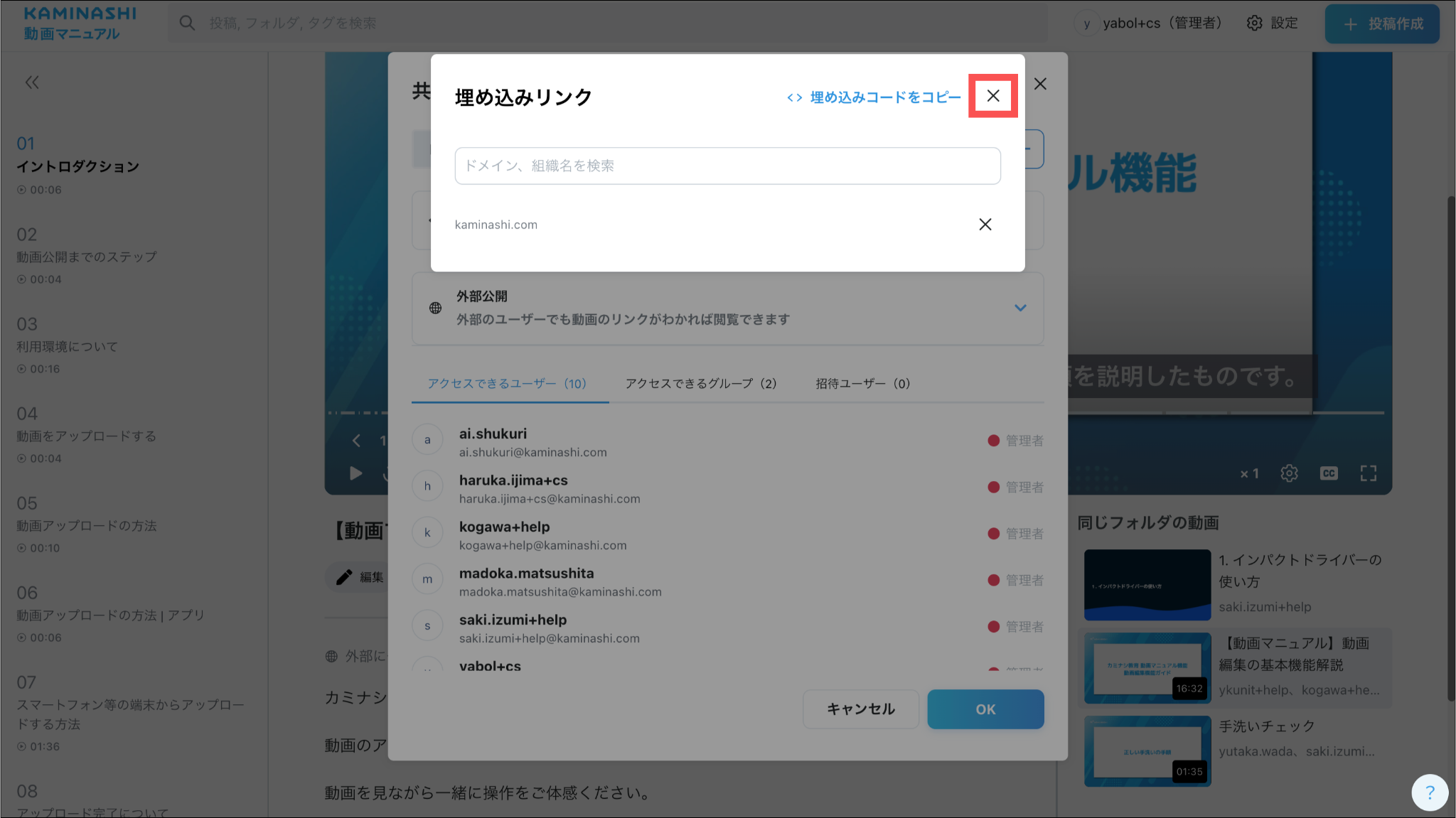 1.カミナシ動画マニュアルにログインする2.「ホーム」または「フォルダ」を開き、埋め込み投稿制限を削除する投稿を押す3.「共有」を押す4.「埋め込みリンクを取得」を押す5.「×」を押す6.赤枠内の「×」を押すそのまま設定を終了する場合は、「OK」を押します。よくある質問は、こちらからご確認ください。