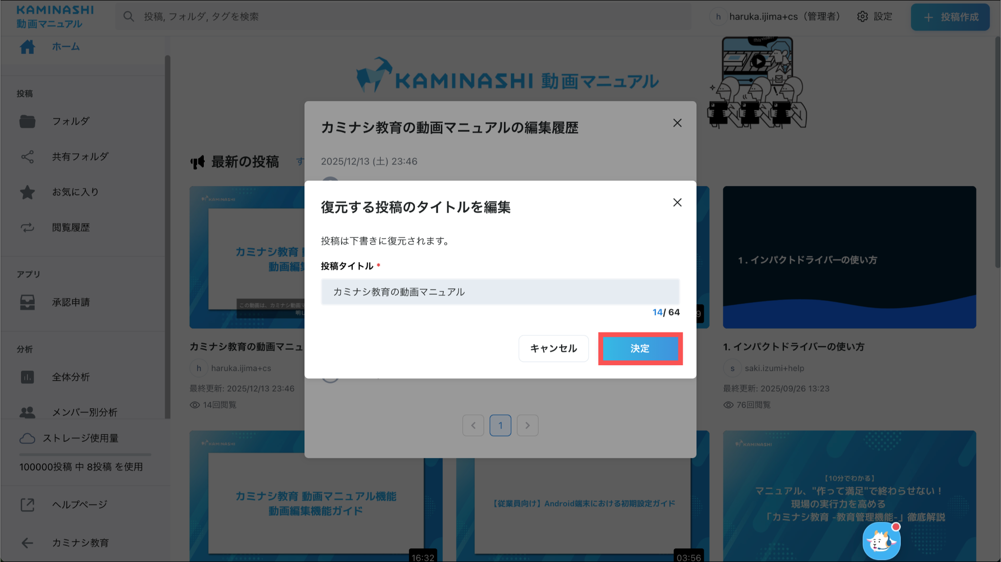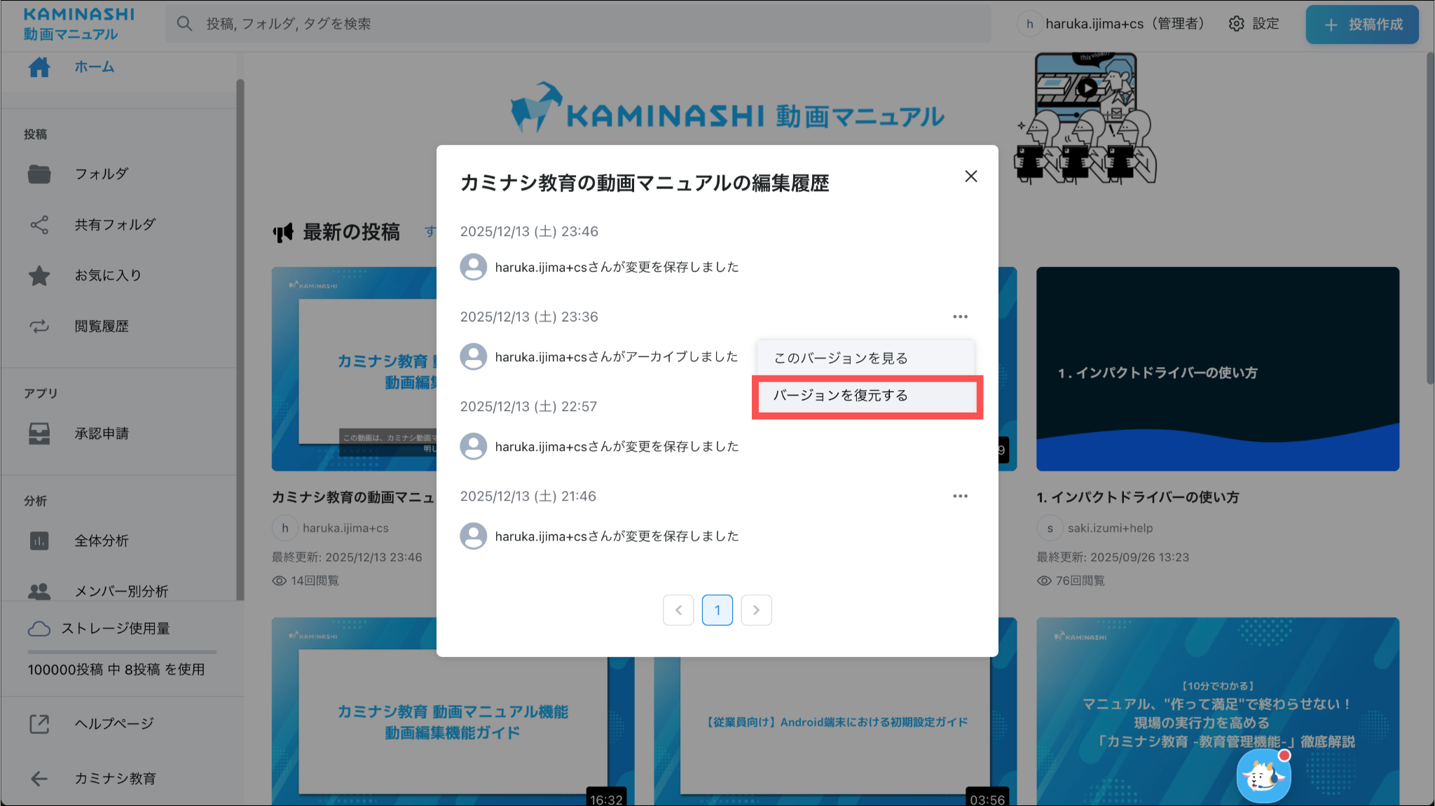 「フォルダ」を開き、該当フォルダの中にある動画投稿にカーソルを合わせ「⋯」を押し、「編集履歴」を選択する。