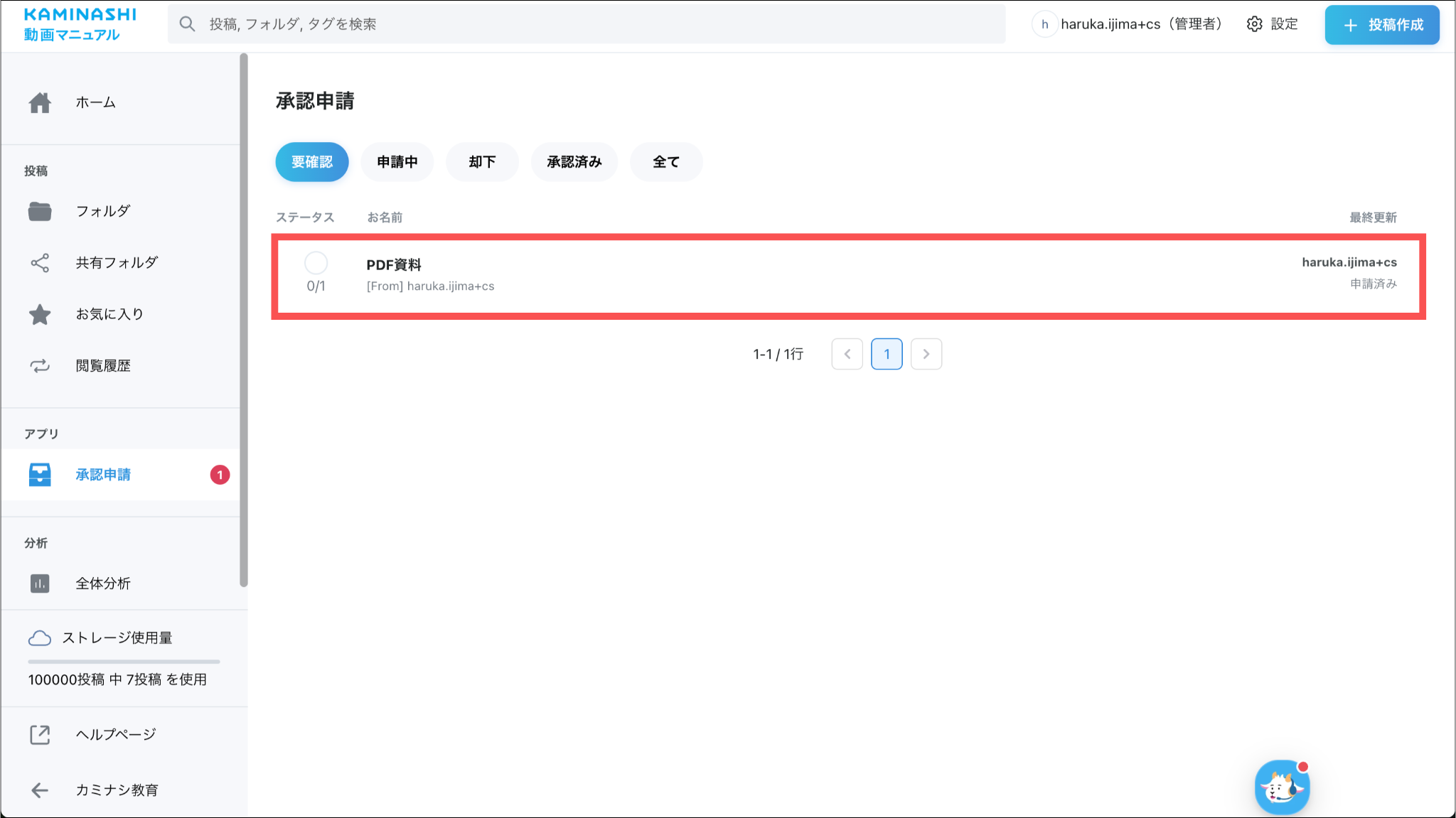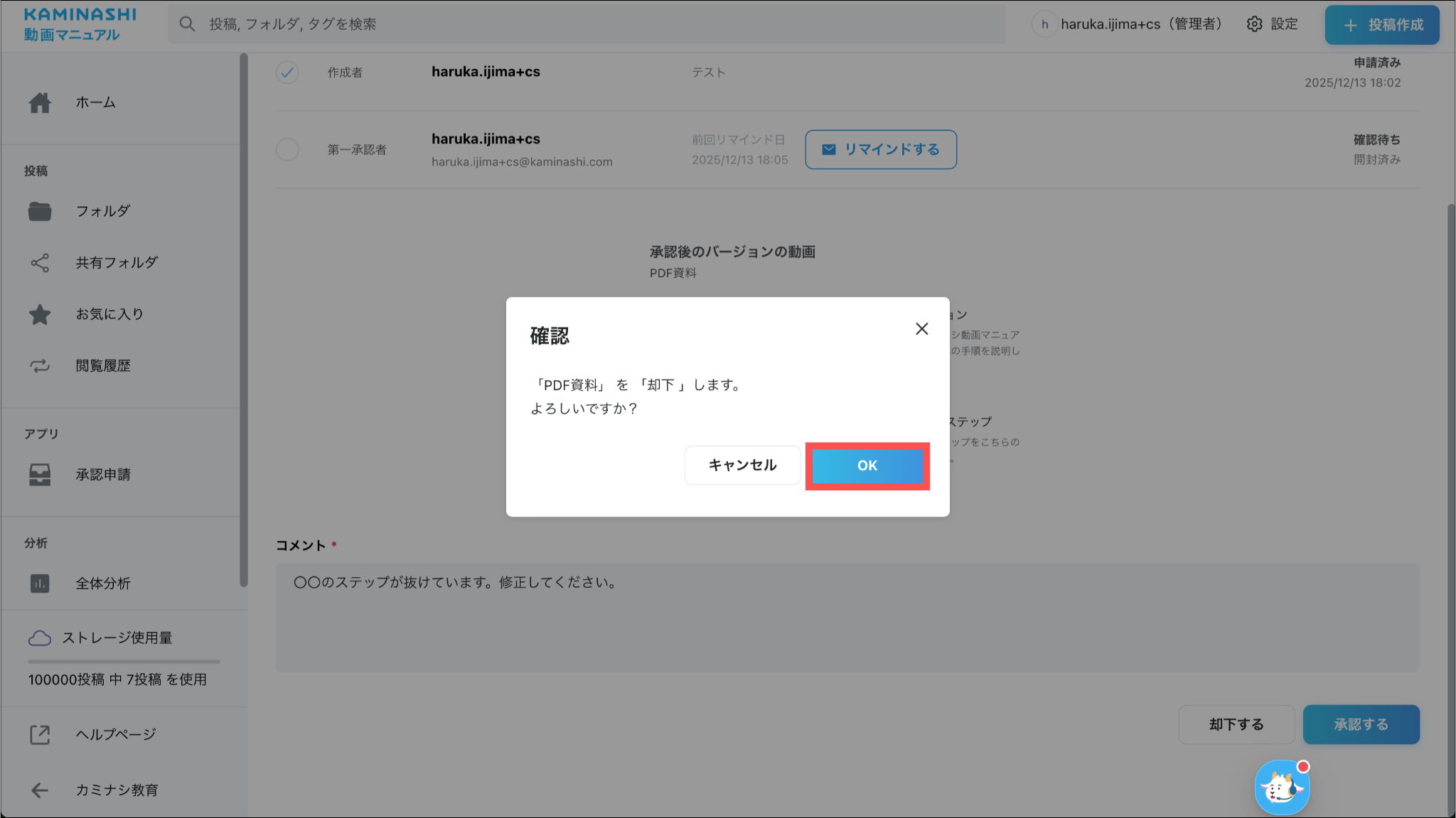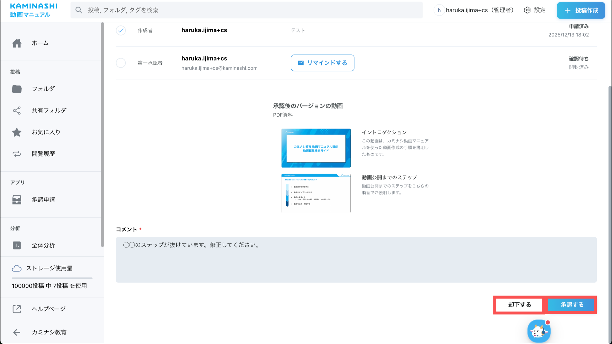 ※改行等でリンクが途中で切れている場合は、最後まで繋いだ状態のURLへアクセスしてください。承認者に指定されたユーザーの承認申請画面に、承認申請中の動画が表示されます。