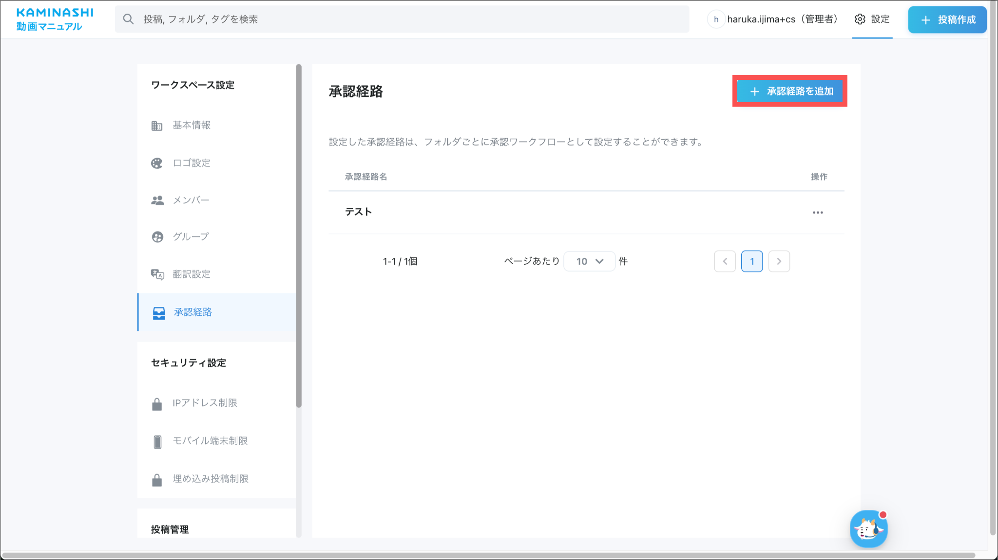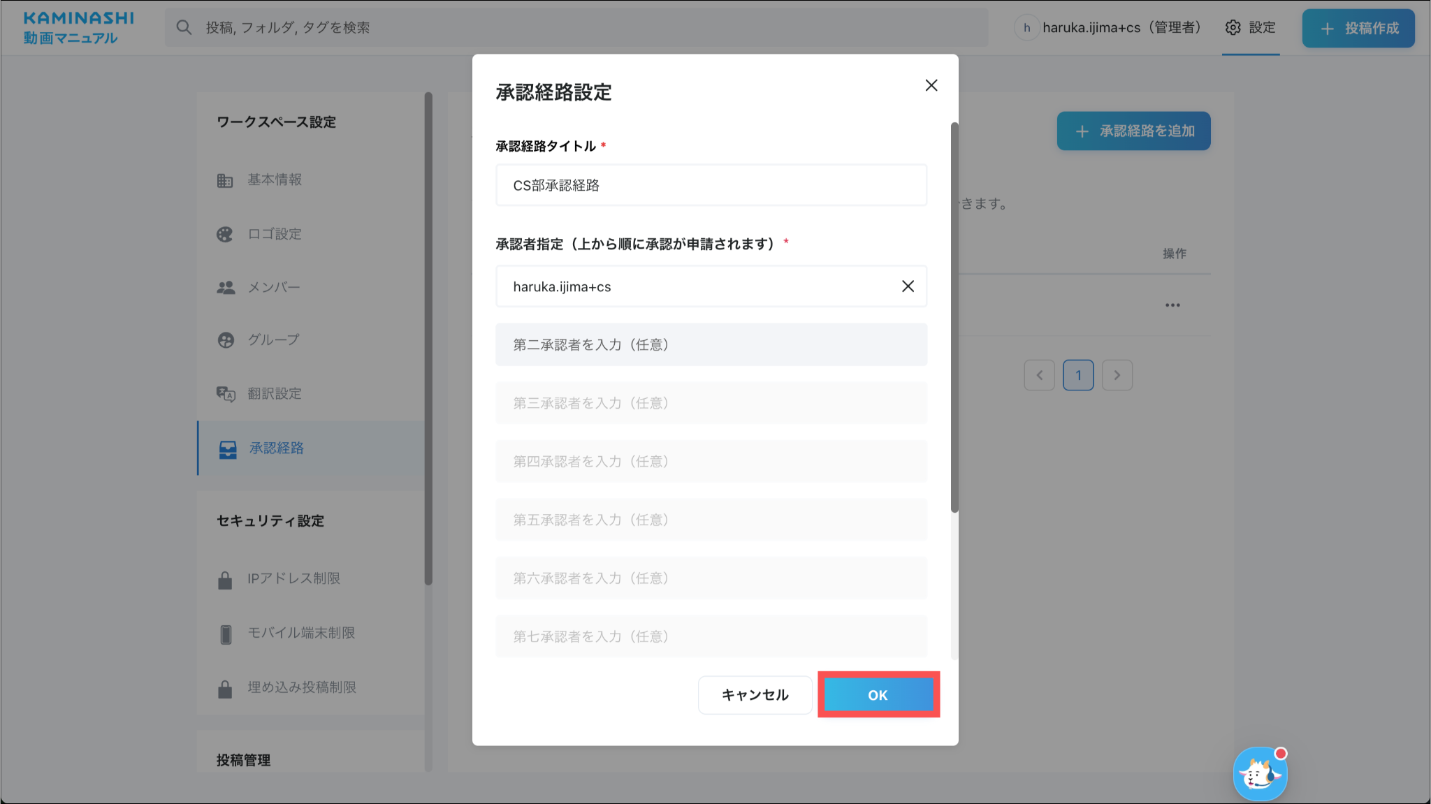 1.カミナシ動画マニュアルにログインする2.「設定」を開き、「承認経路」を押す3.「+ 承認経路を追加」を押す4.承認経路タイトルと承認者を設定し、「OK」を押す承認者は複数ユーザー指定することができます。複数ユーザーを指定した場合は、第一承認者から順に承認が申請されます。5.フォルダに承認経路を設定する設定方法については「フォルダを編集する」をご参照ください。「投稿の公開や更新に承認を必須にする」をオンにすると、投稿の公開・更新時に承認を必須にすることができます。この場合、承認されていない動画は公開することができません。よくある質問は、こちらからご確認ください。