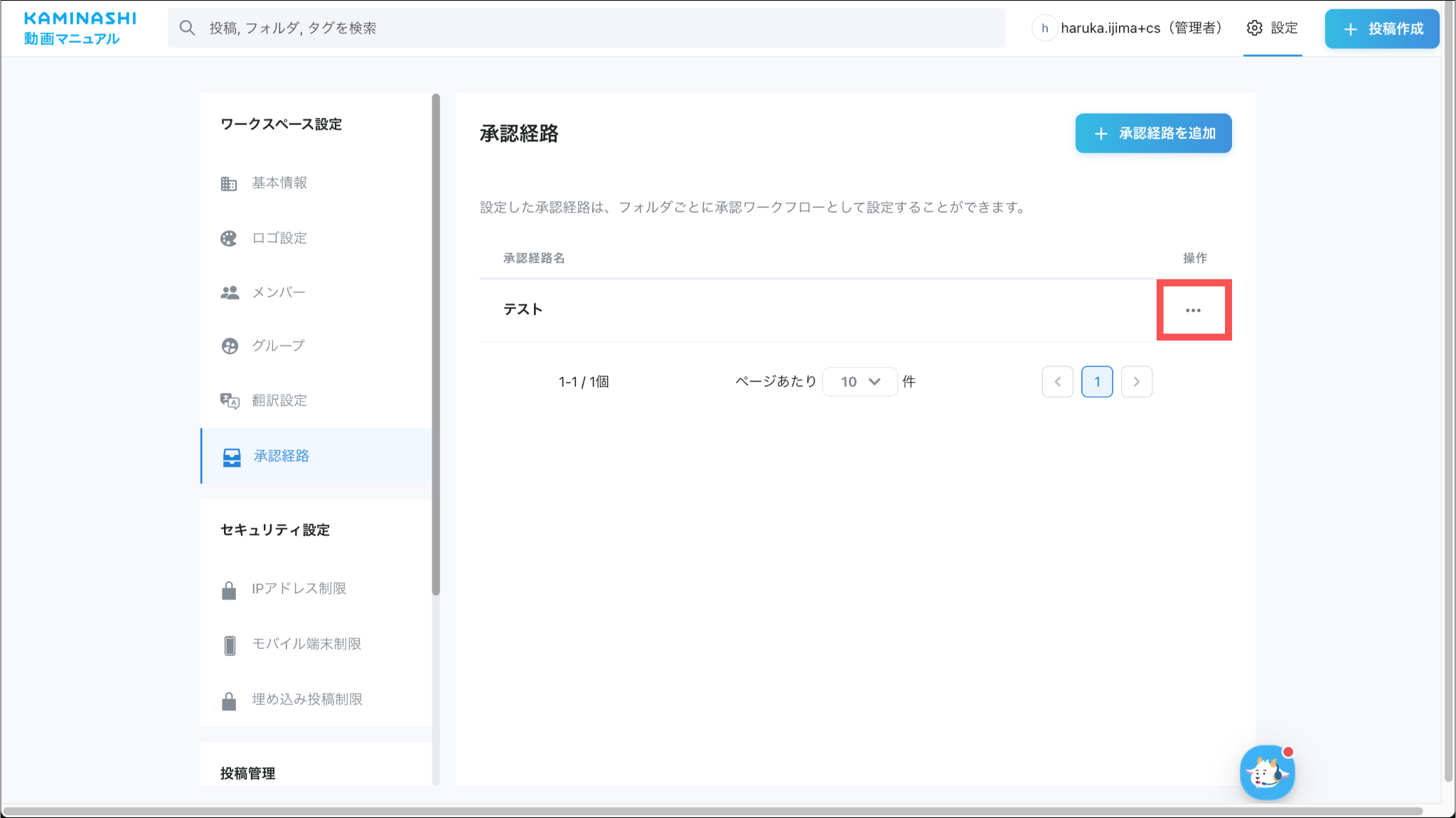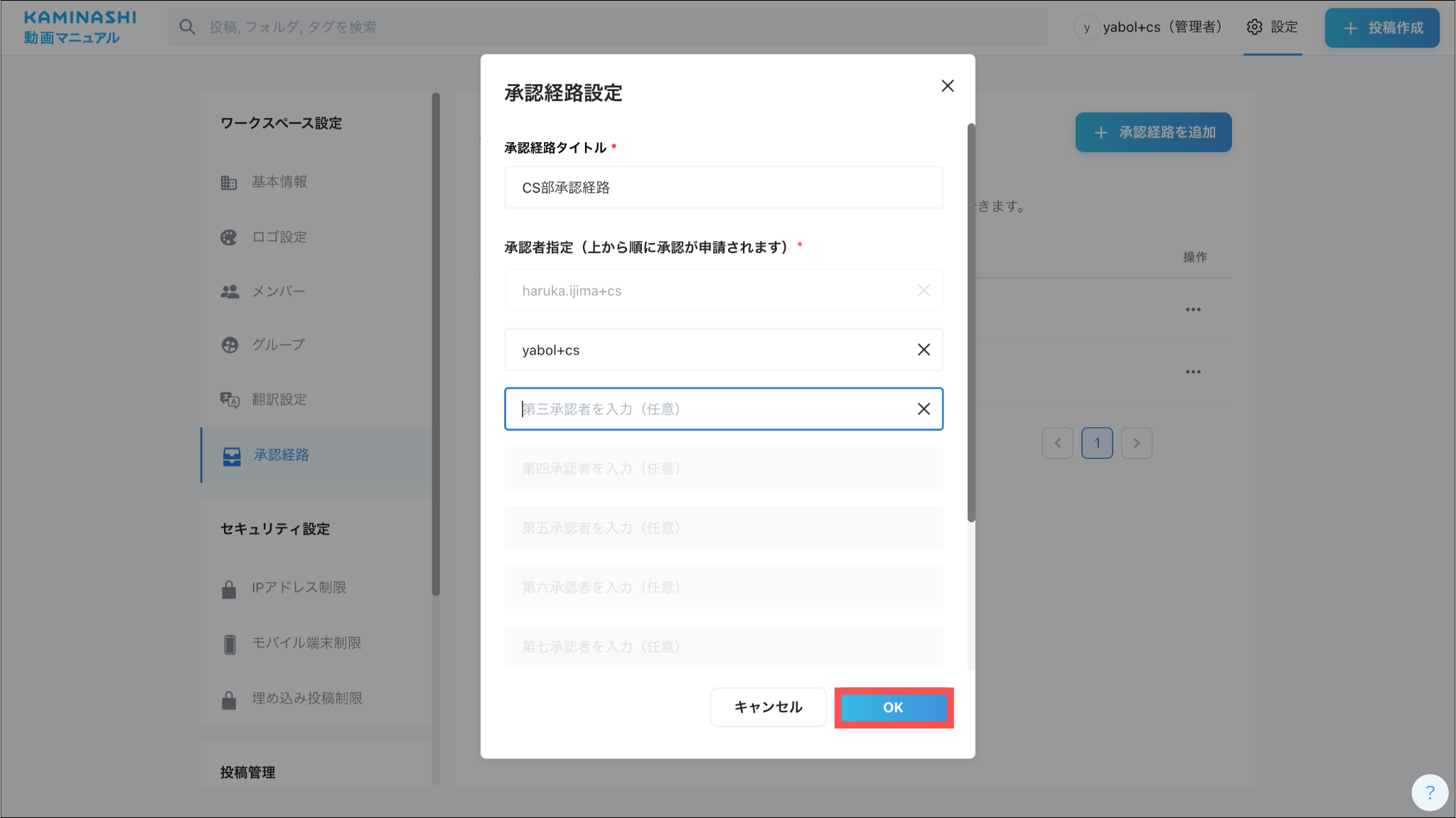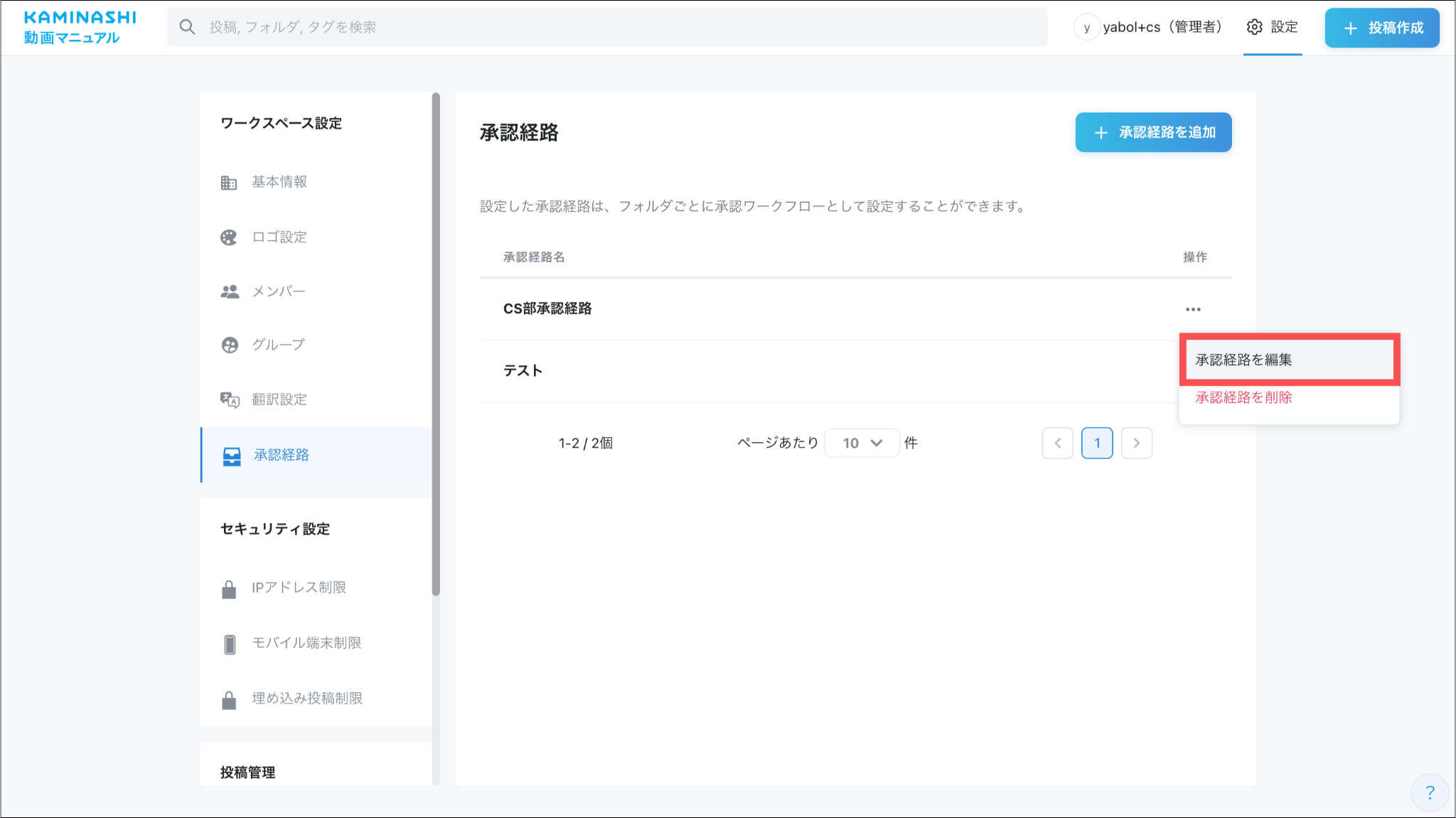 1.カミナシ動画マニュアルにログインする2.「設定」を開き、「承認経路」を押す3.編集する承認経路の「⋯」を押す4.「承認経路を編集」を押す5.承認経路を編集し、「OK」を押す承認者を入力して追加することができます。よくある質問は、こちらからご確認ください。