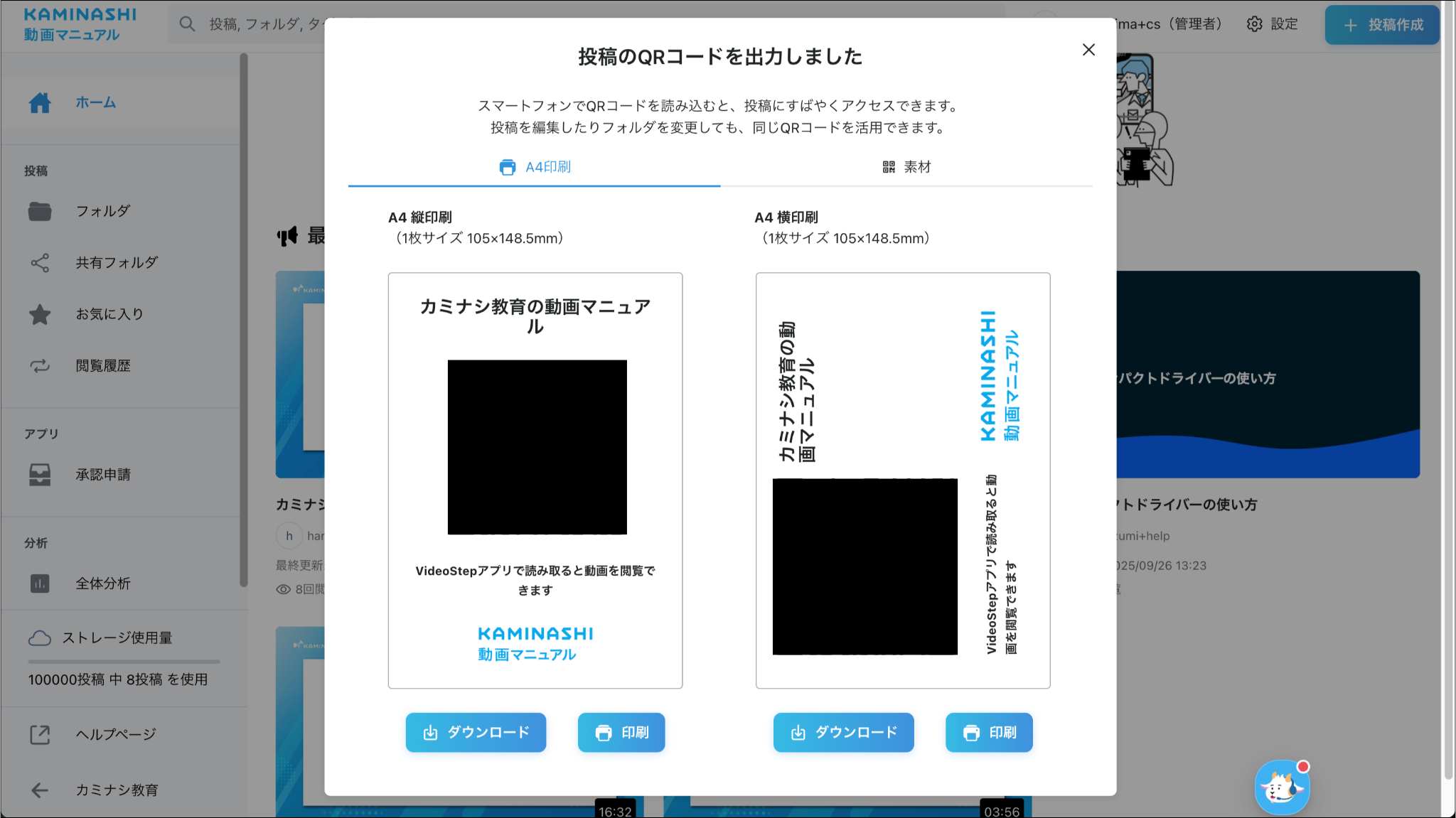 1.カミナシ動画マニュアルにログインする2.「ホーム」または「フォルダ」を開き、QRコードを発行する動画の「⋯」を押し、「QRコード発行」を選択する3.印刷、またはダウンロードし従業員へ配布するアプリでQRコードを読み取ると、スムーズに閲覧画面を開くことができます。※QRコードは株式会社デンソーウェーブの登録商標です。よくある質問は、こちらからご確認ください。