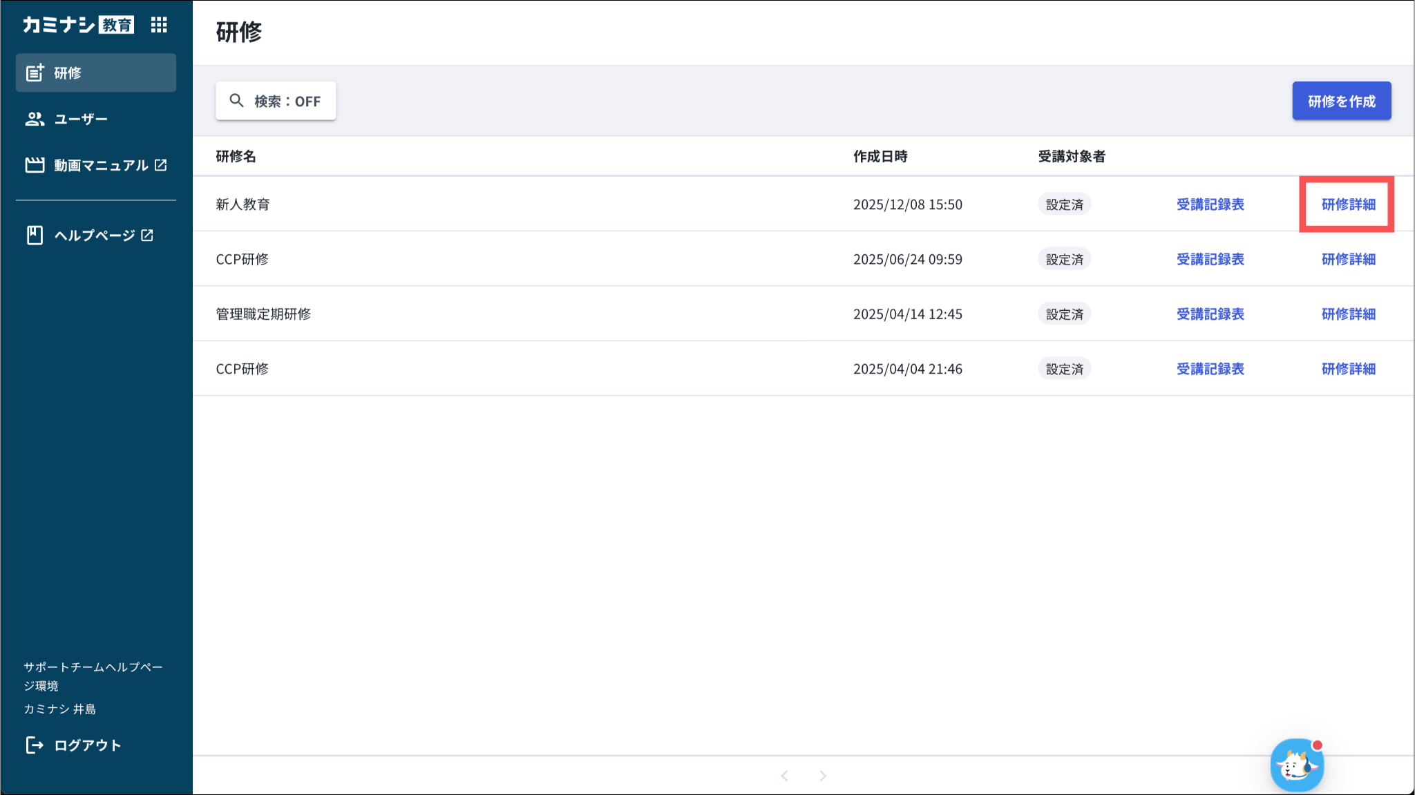 研修一覧画面にある「設定済」を押すと、直接この画面を開くこともできます。