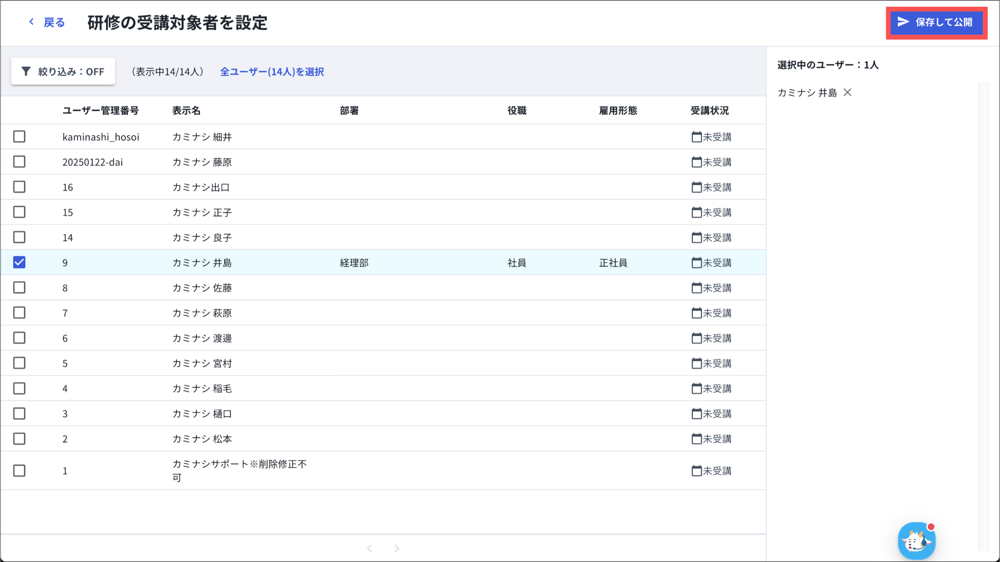 また、ユーザーの絞り込み方法については、「研修を作成する:9.受講対象者を設定する」をご参照ください。