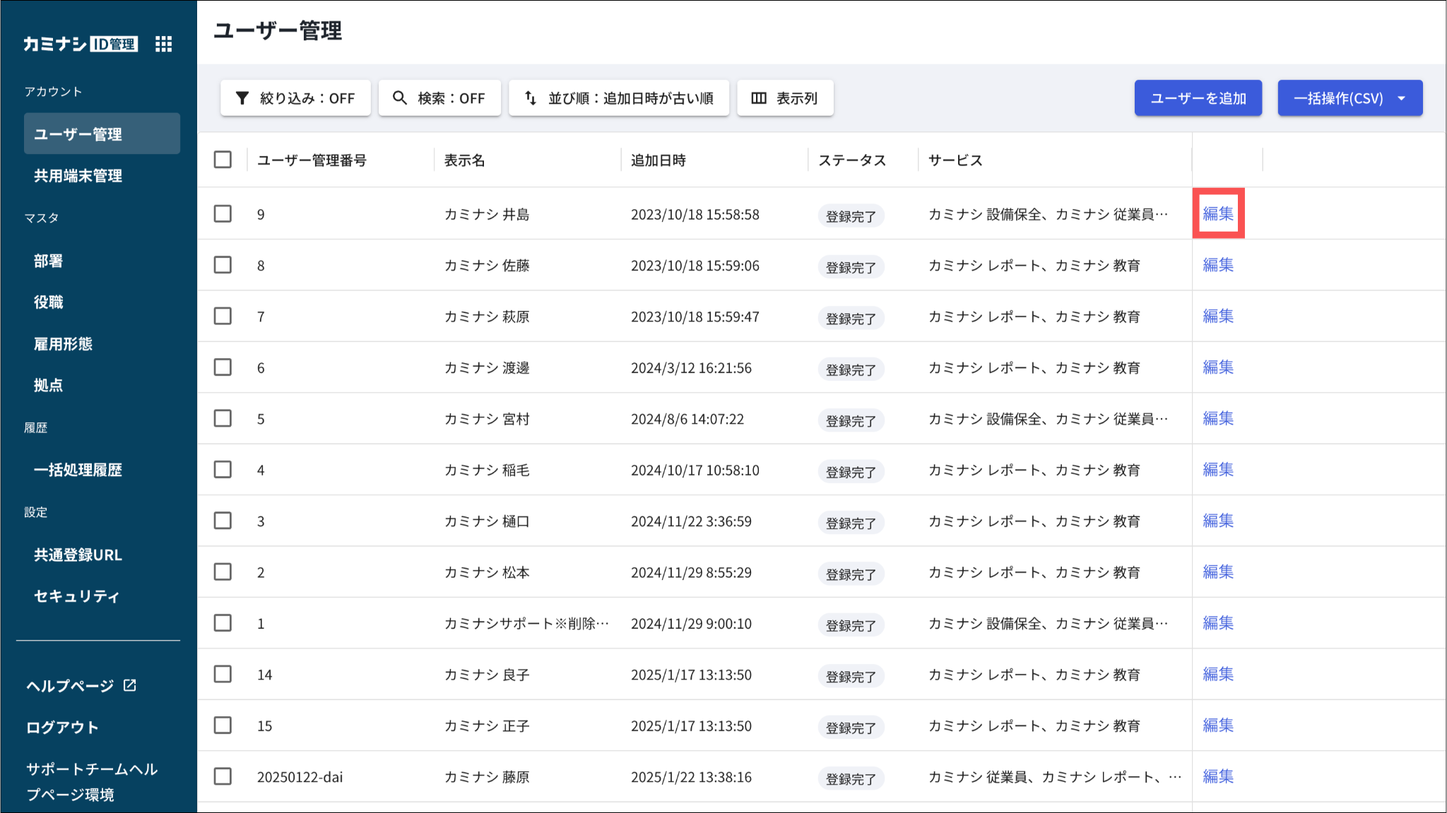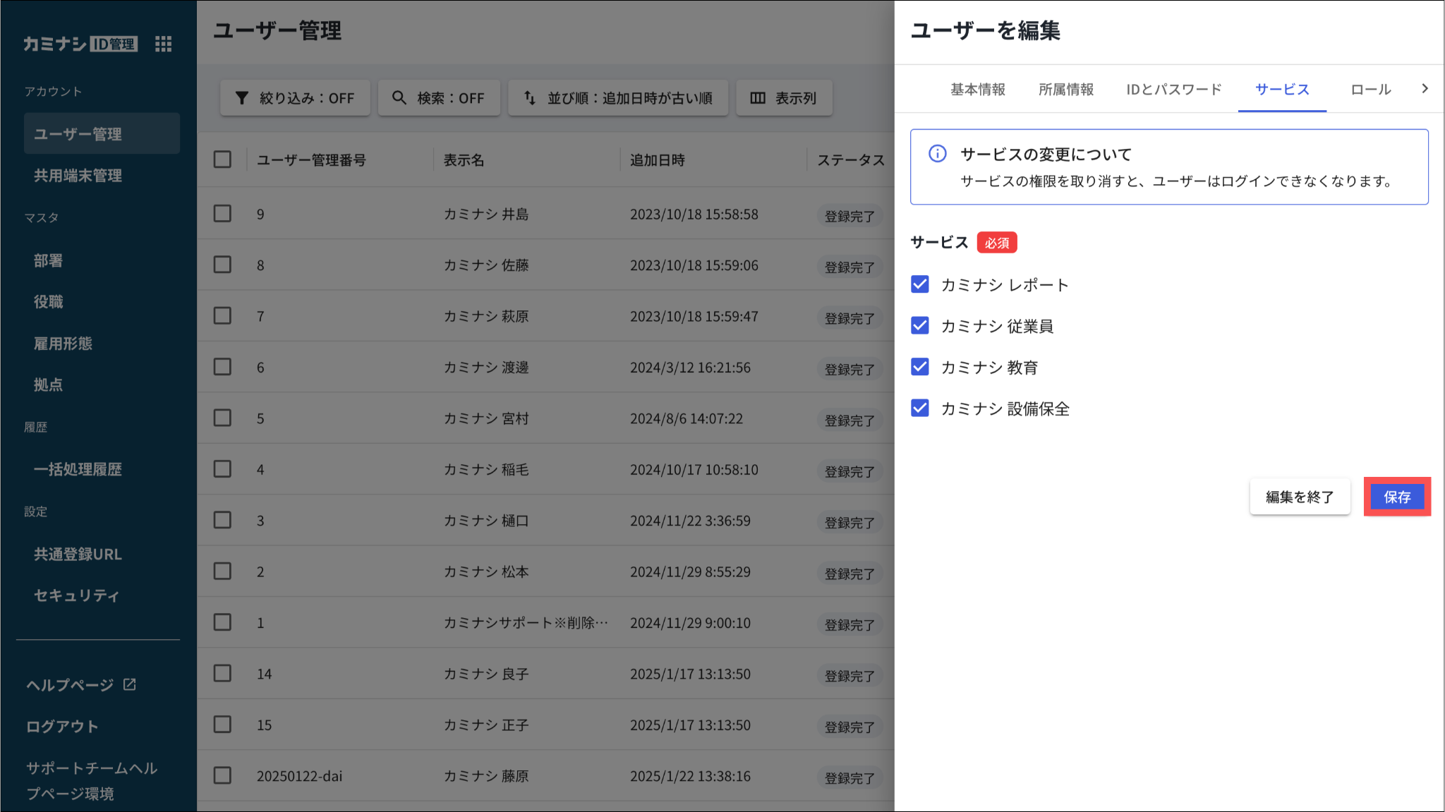 すでに他サービスで登録済みのユーザーがいる場合、新たに「カミナシ教育」を利用できるようにするには、そのユーザーに「カミナシ教育」のサービス利用権限を付与する必要があります。