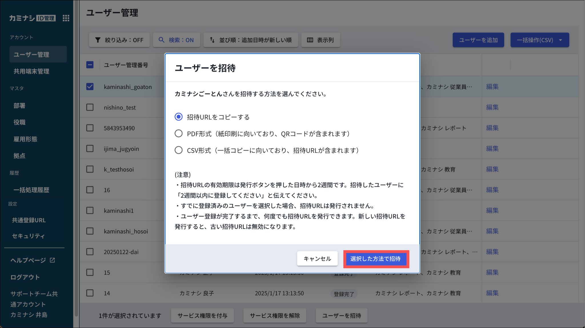 特徴:1名のみ選択されている場合、直接招待URLをコピーできます。それを用いて初期設定を行います。