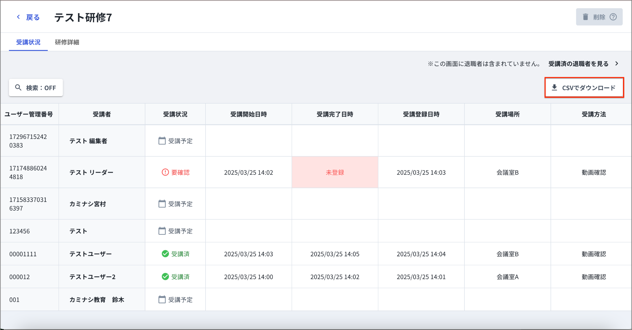 今まで管理画面内でしか確認できなかった「受講状況」がCSVファイルでダウンロードできるようになりました。データの保管や集計、分析にご利用ください。