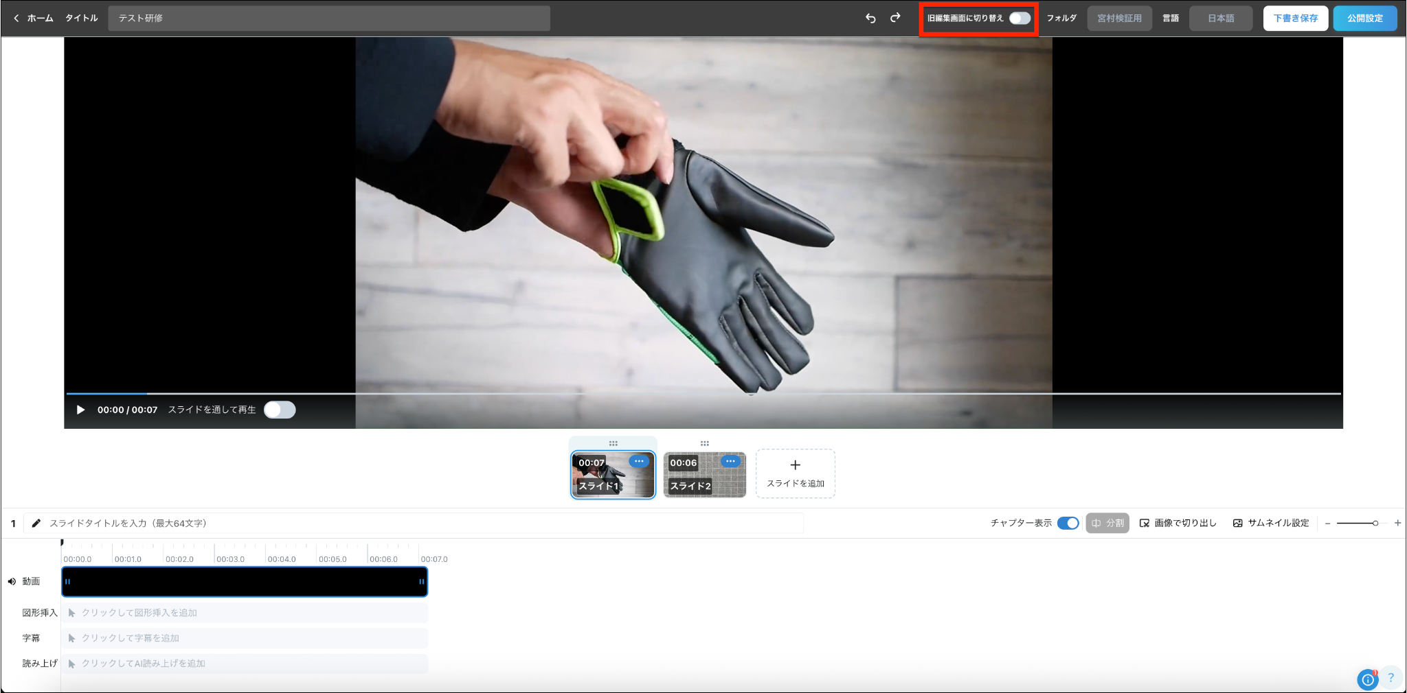 編集画面の詳細は「動画マニュアルを編集する(新編集画面)」「動画マニュアルに図形や文字を挿入する(新編集画面)」「動画マニュアルに字幕を作成する(新編集画面)」「動画マニュアルにAI読み上げを生成する(新編集画面)」をご参照ください。