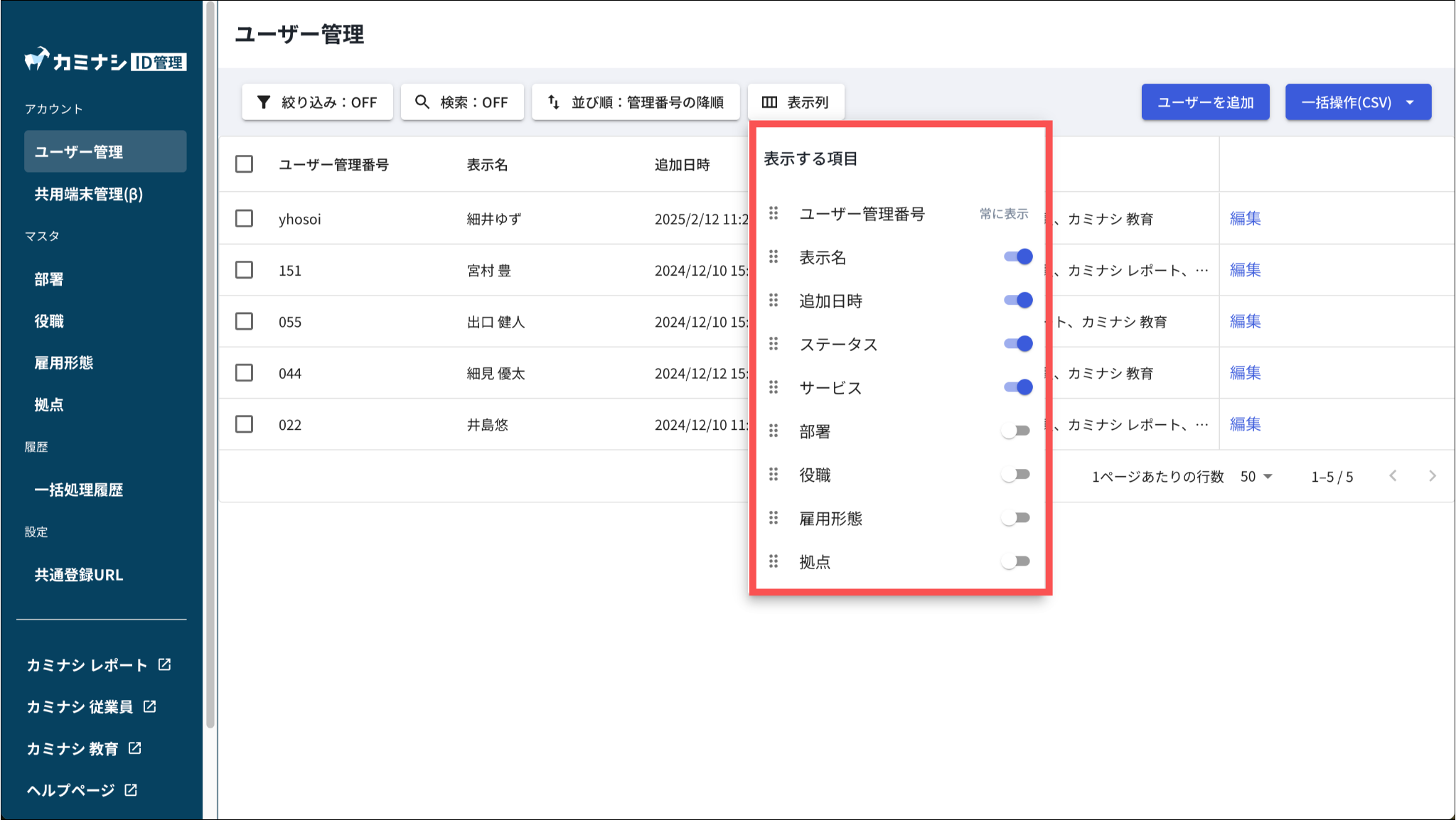 表示列の変更方法については「ユーザーを検索する:5.「表示列」を押し、表示列を変更する」をご参照ください。