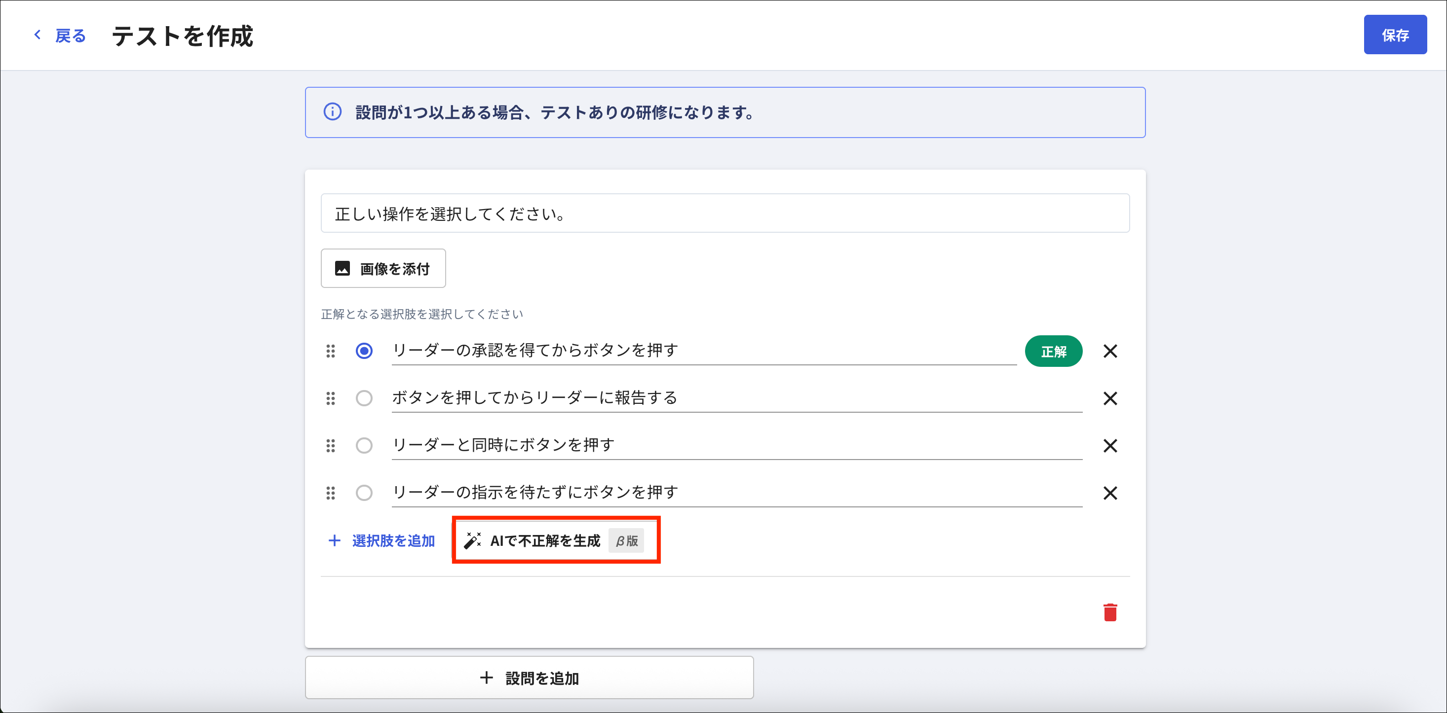 「設問」や「正解となる選択肢」が曖昧な場合、不正解となる選択肢が生成されない場合があります。その場合は、内容をより具体的に修正してから再度お試しください。