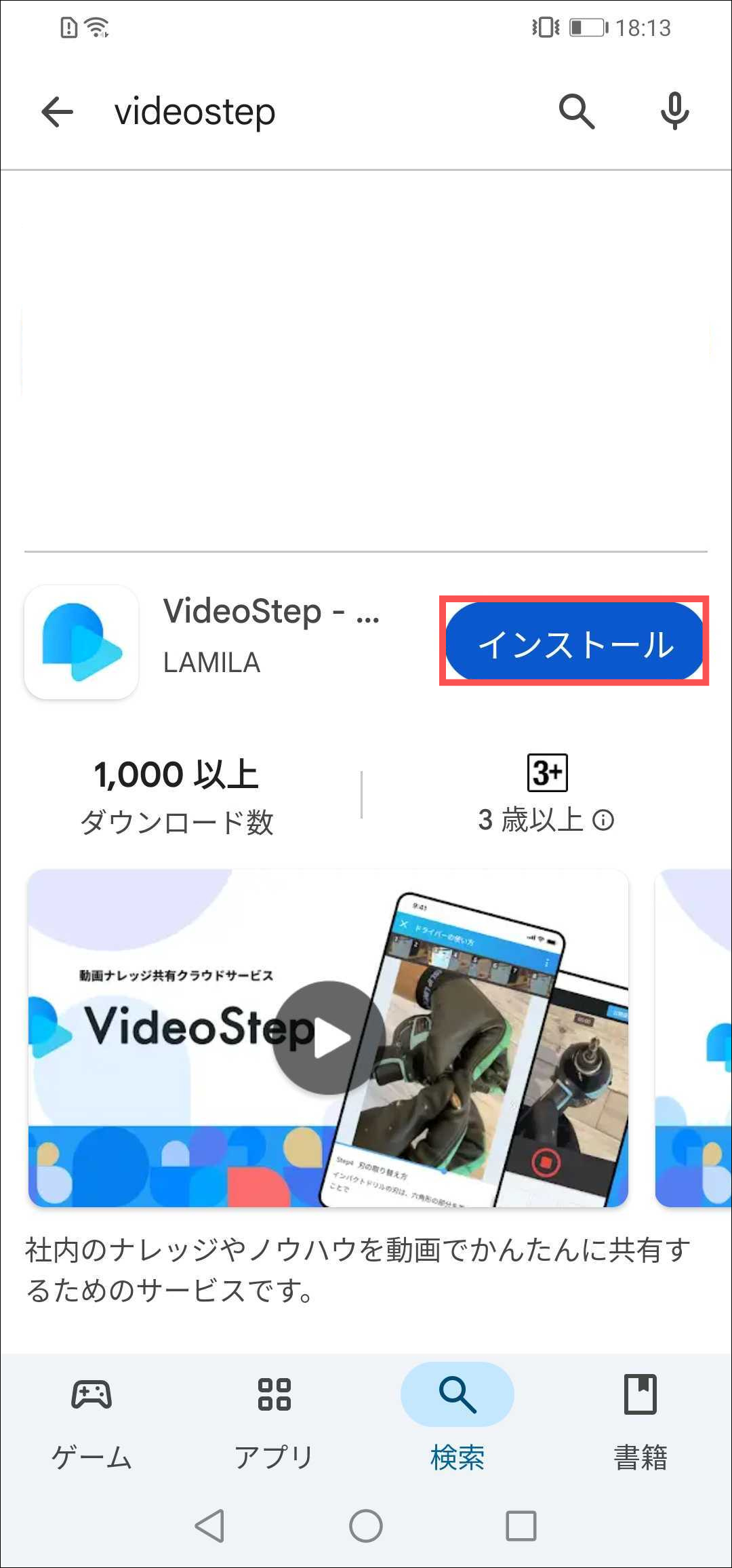 2.「videostep」と検索し、「インストール」を押す