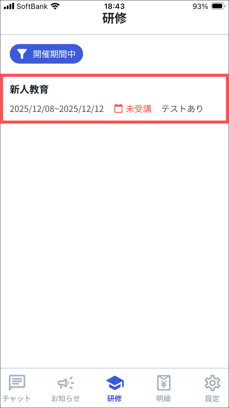 「開催期間中」を押すと開催期間外の研修も表示されます。