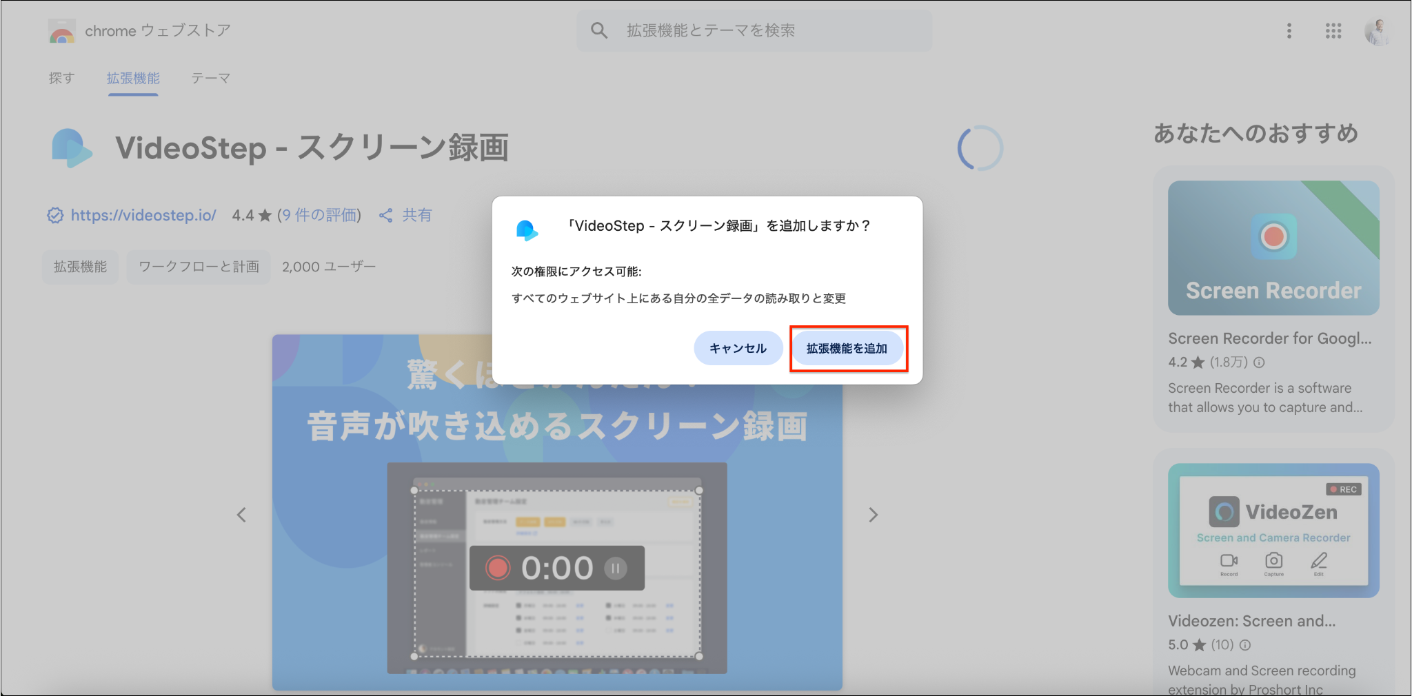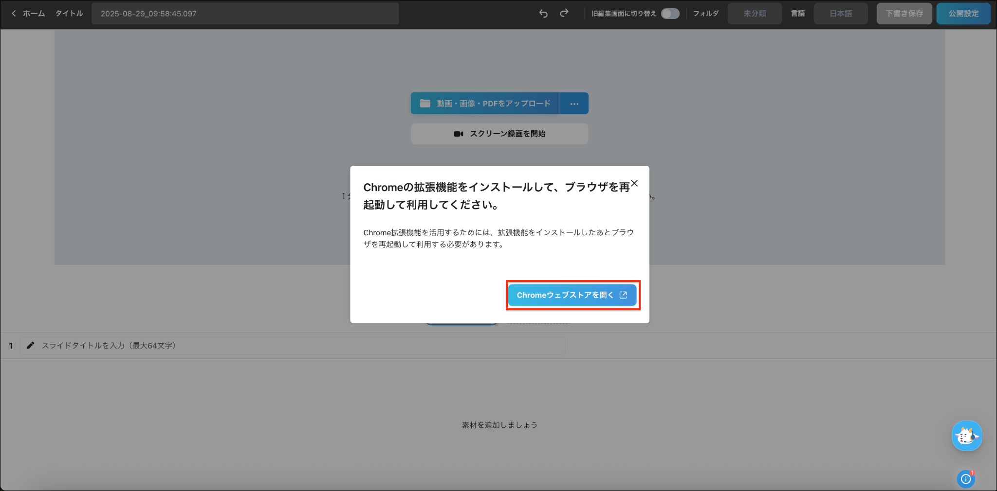 スクリーン録画をご利用するためには、Chromeの拡張機能をインストールする必要があります。