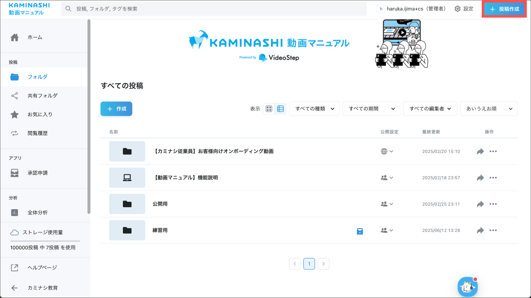 「フォルダ」を開き、「+作成」を押し、「動画投稿を作成」を押すことでも作成出来ます。