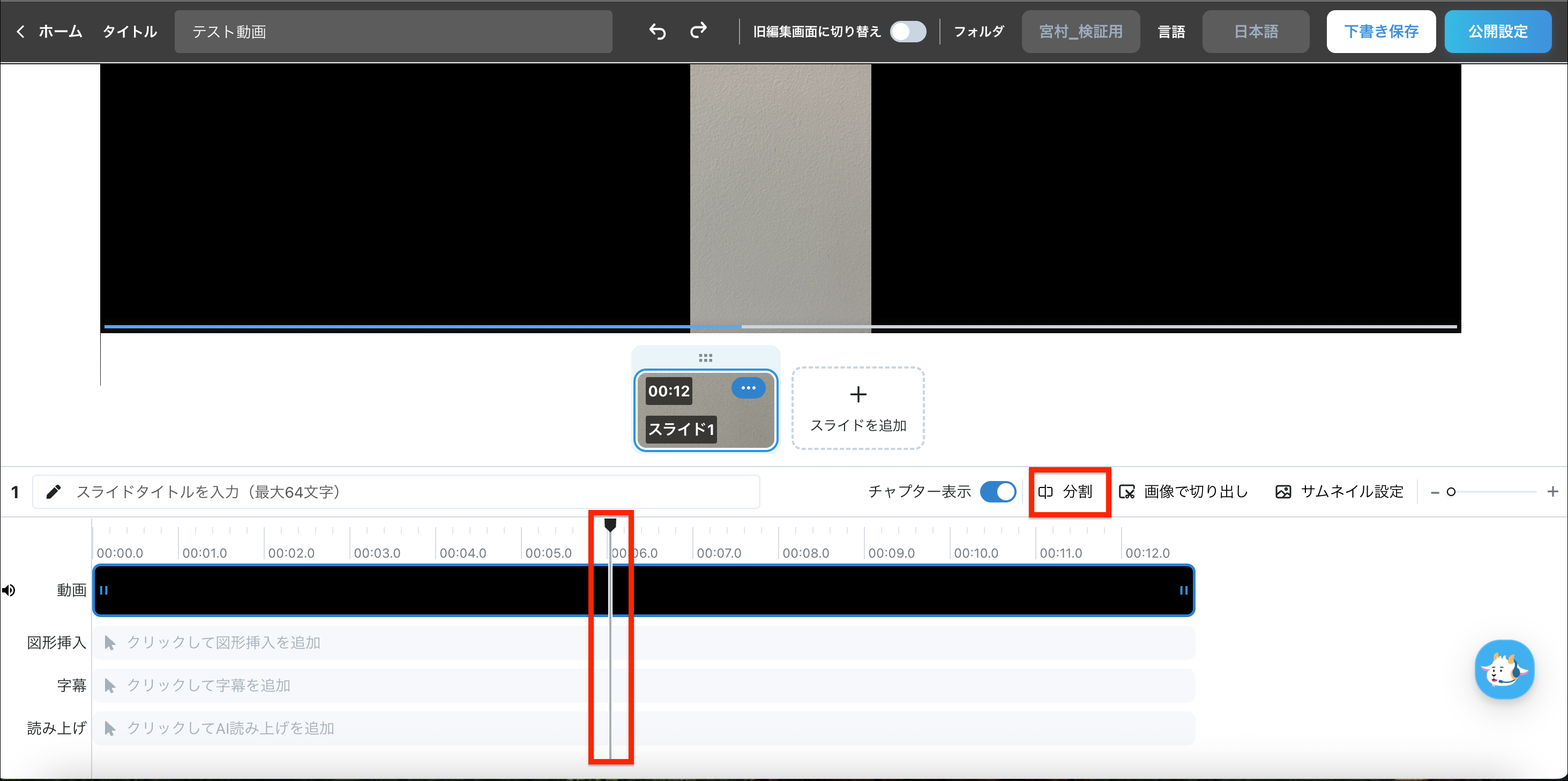 例として、「12秒の動画にて、6〜9秒の3秒間を削除するケース」を想定し、手順をご紹介します。