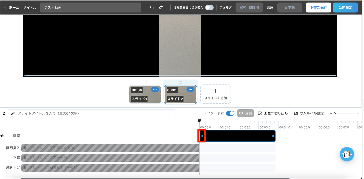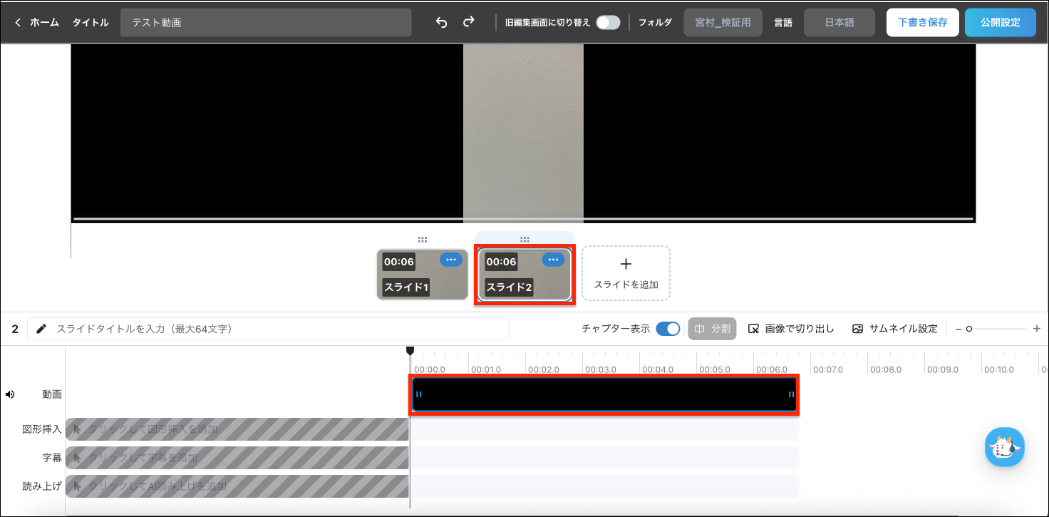 なお、「スライド1」を開くと動画の時間が「0秒〜6秒」となっていることを確認できます。