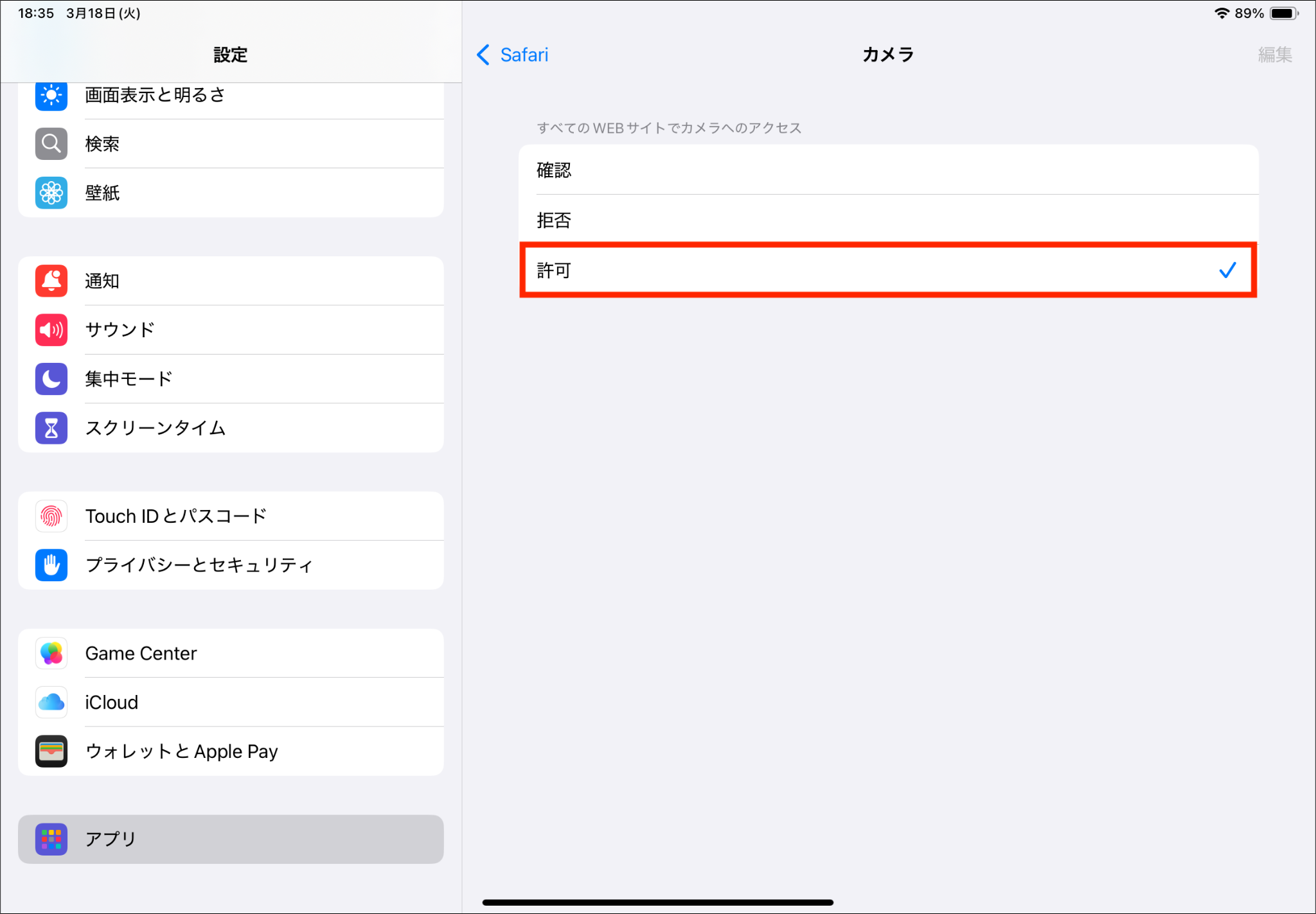 A.iPadの「設定アプリ」から「カメラ」を許可してください 。「設定アプリ>アプリ>Safari>webサイトの設定のカメラ>許可」の順に押すと次回以降確認画面が表示されず、QRコードを読み取ることができます。※QRコードは株式会社デンソーウェーブの登録商標です。