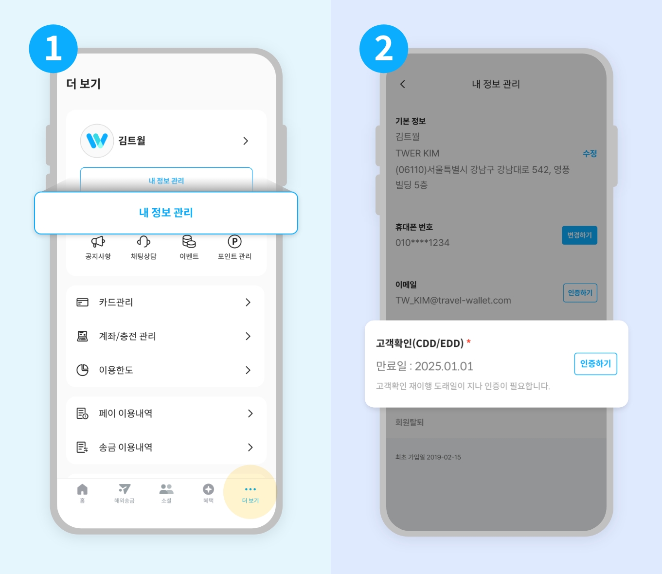 트래블월렛 앱 → 우측 하단 ‘더보기’ → 내 정보 관리 → 고객확인