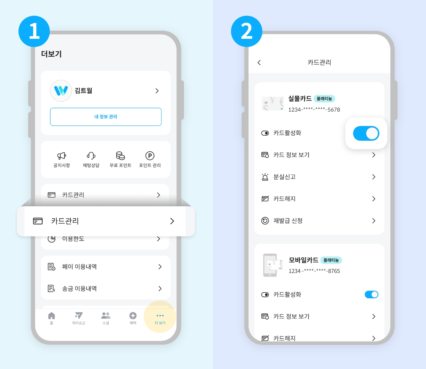 트래블월렛 앱 → 우측 하단 ‘더보기’ → 카드관리 → 카드활성화 ON