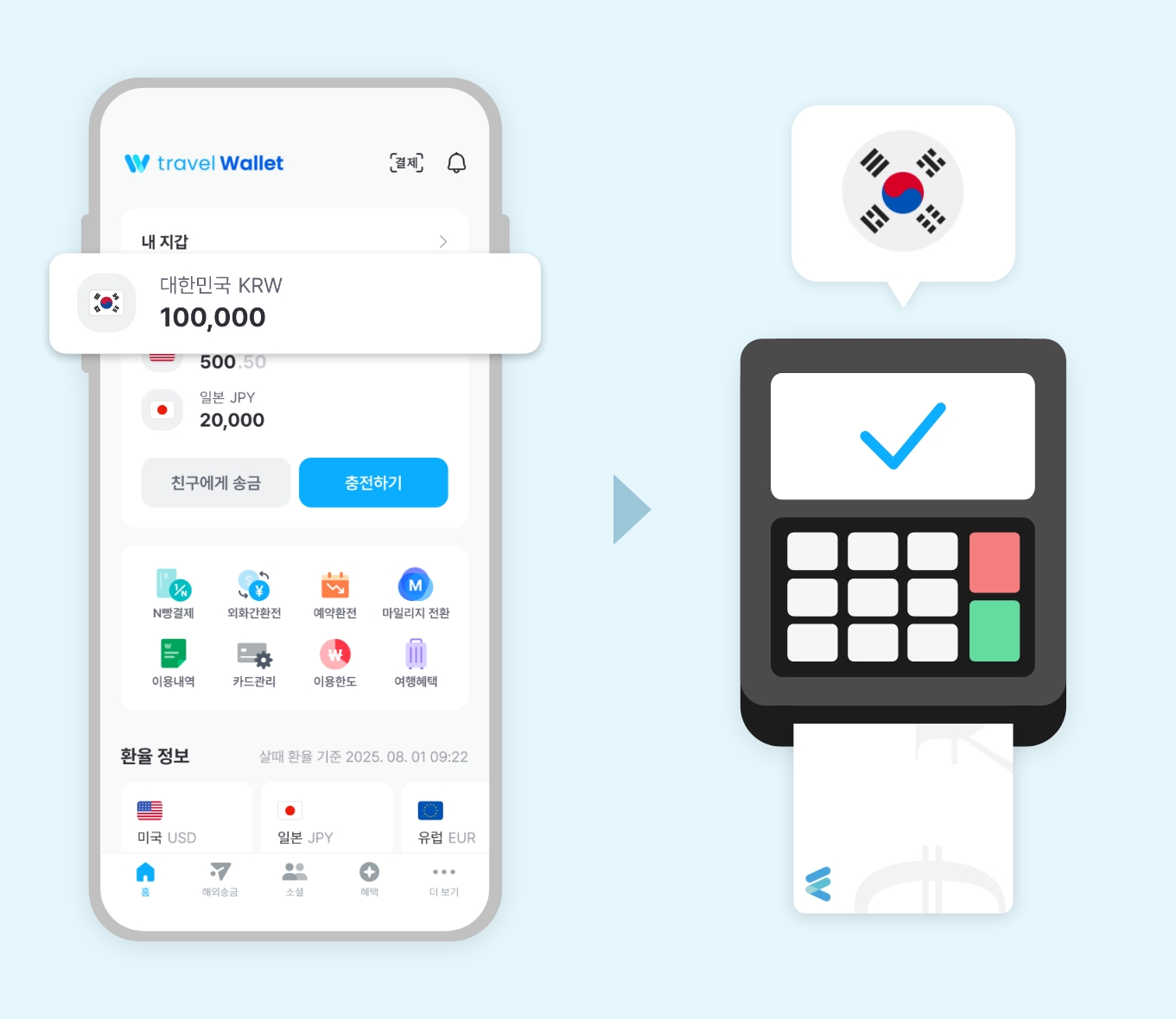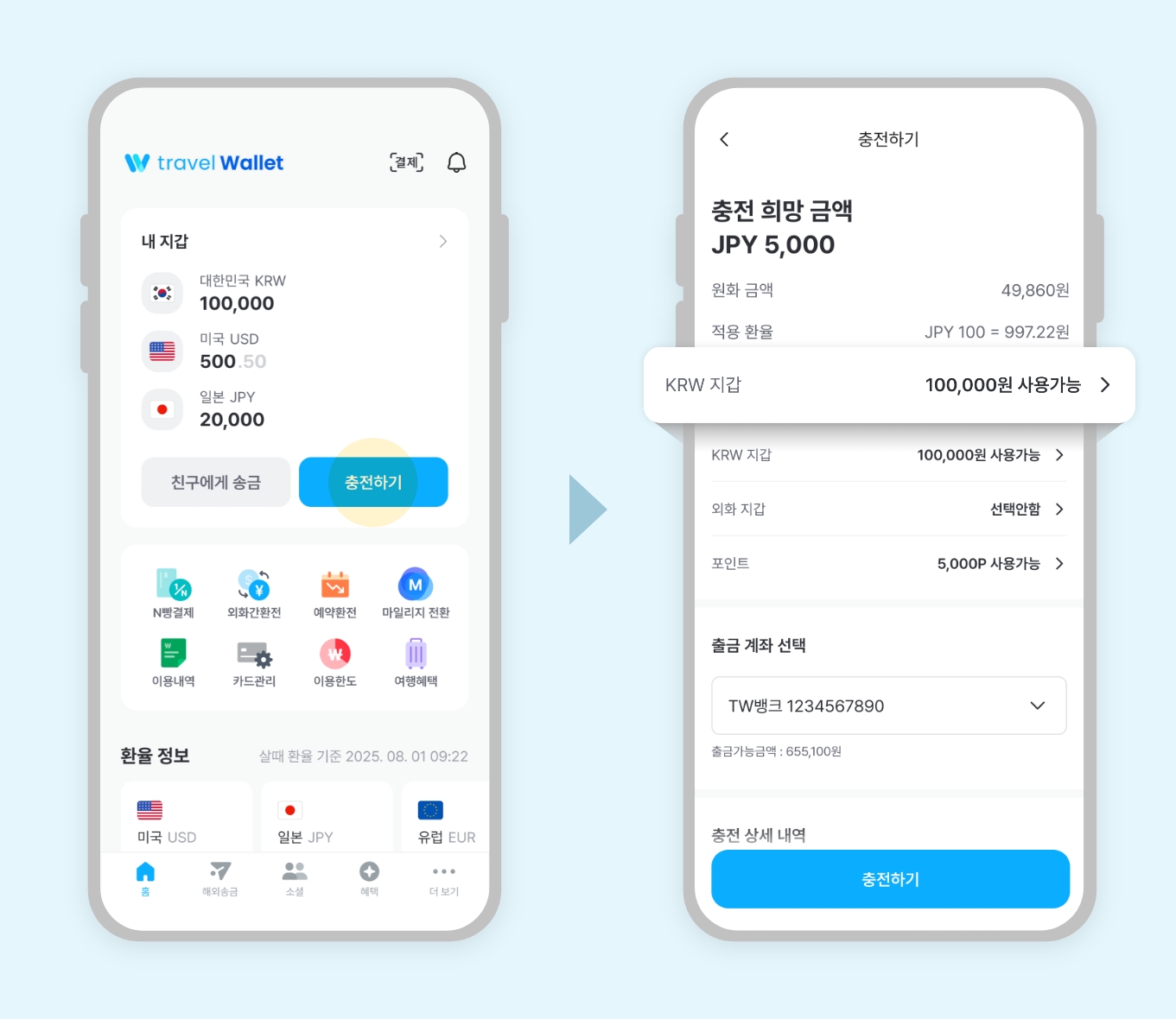 트래블월렛 앱 → 충전하기 → 외화 선택 → KRW 지갑