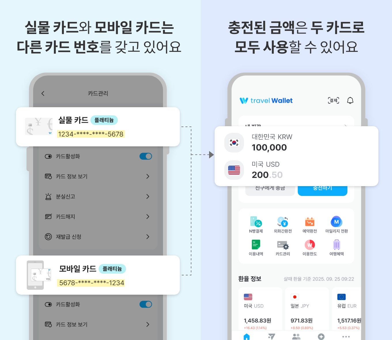 트래블월렛 앱에서 충전한 통화는 별도의 설정 없이 두 카드로 모두 사용이 가능합니다.